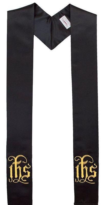 This premium I (iota) H (eta) S (sigma) Ultra Satin Black Clergy Stole is embroidered with the initials IHS, a Christ-o-gram, representing Jesus Christ Holy Name. Ideal for a Minister, Pastor, Reverend, Bishop, Chaplain, and is suitable for one who is truly In His Service.