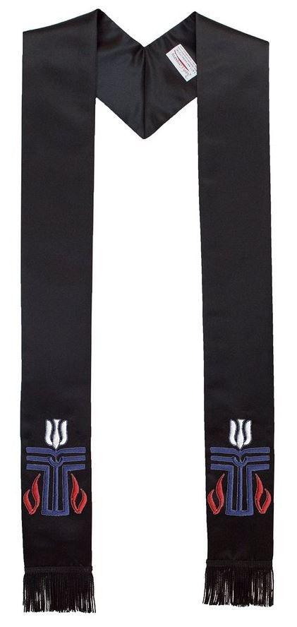 This premium Black Ultra Satin Clergy Stole with Black fringe has an beautiful embroidered design with the Seal of the Presbyterian Church. Includes the cross, fish, descending dove, book-scripture, lectern or pulpit, burning bush, Pentecost fire, and the Trinity.