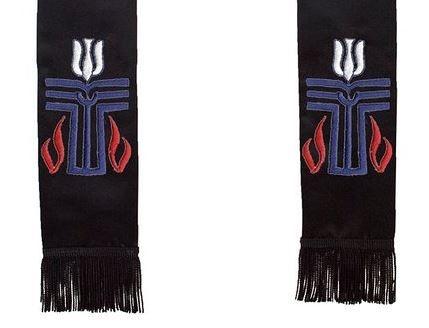 - Black Ultra Satin Clergy Stole with fringe embroidered with the Presbyterian Church seal symbol