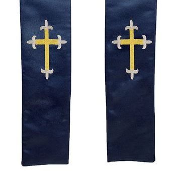 This premium Navy Blue Ultra Satin Baptism Gold and Silver Cross Clergy Stole is embroidered on both front sides with detailed two tone Gold and Silver threading. Unisex. Perfect for a Church Service, Ceremony, Baptism, Dedication, Wedding or Funerals.