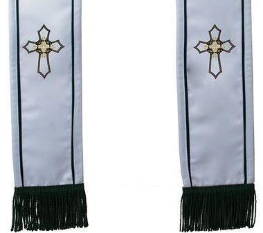 - White Ultra Satin Celtic Knot Cross Clergy Stole with White & Black border includes Jet Black fringe