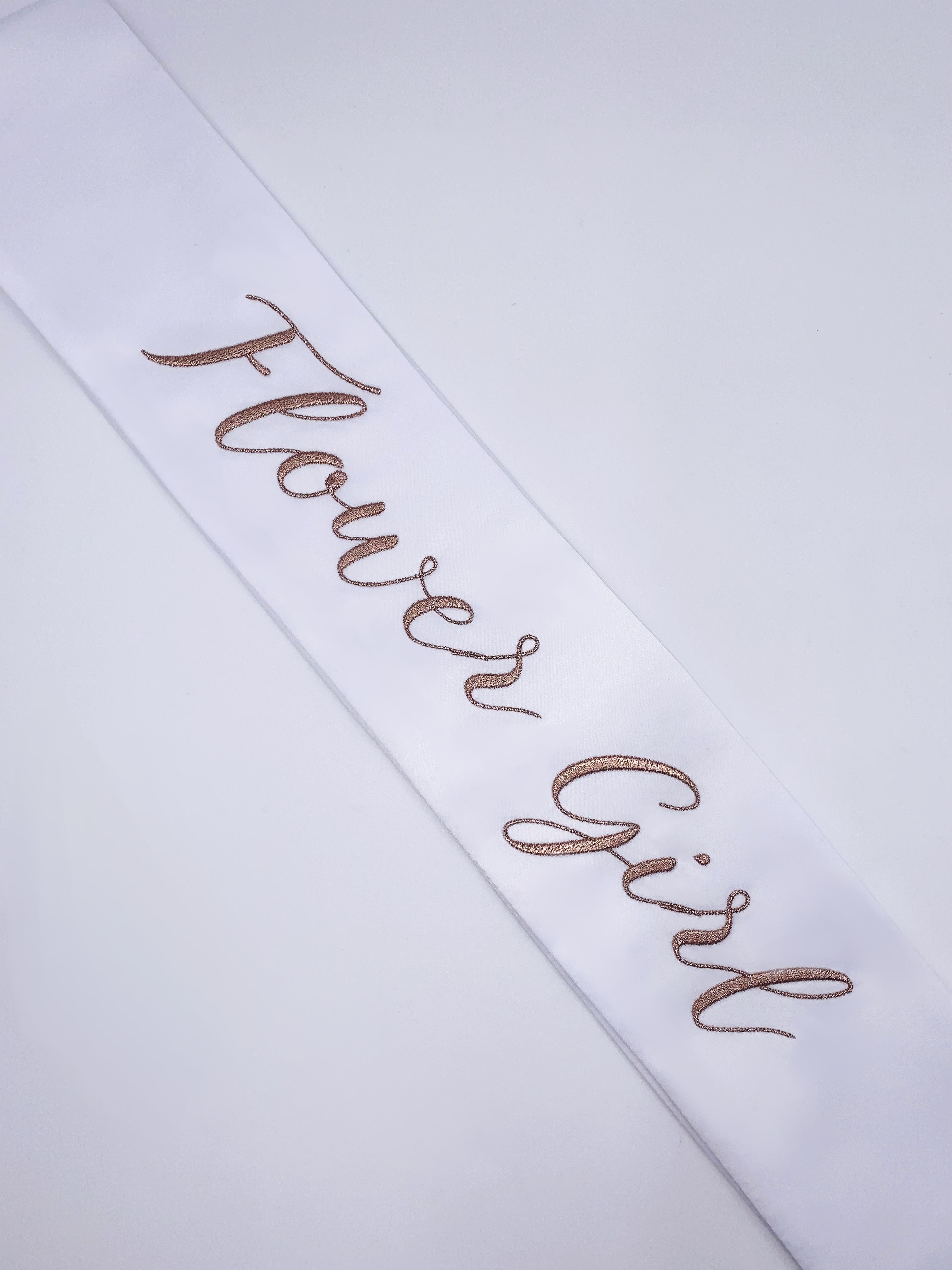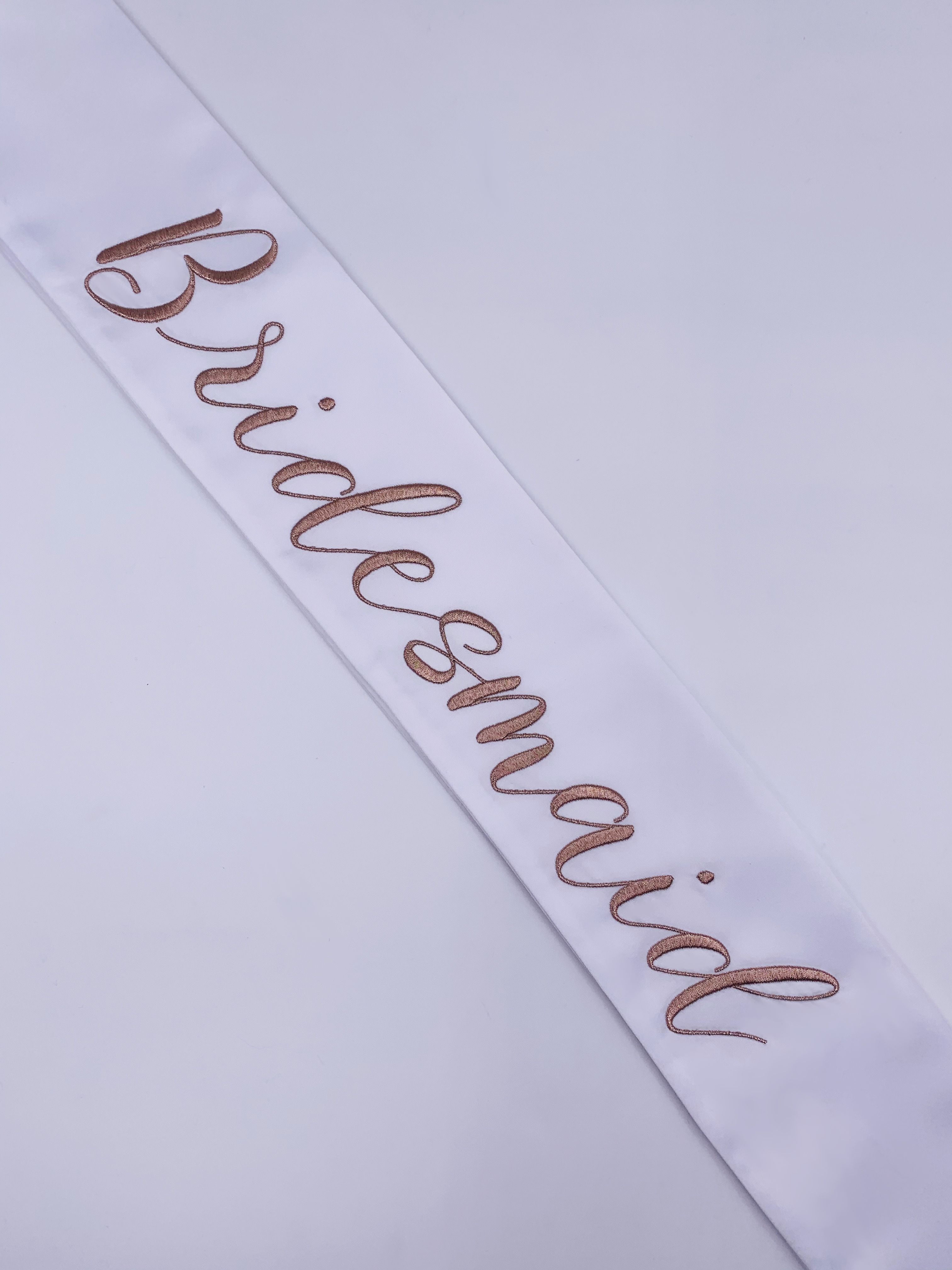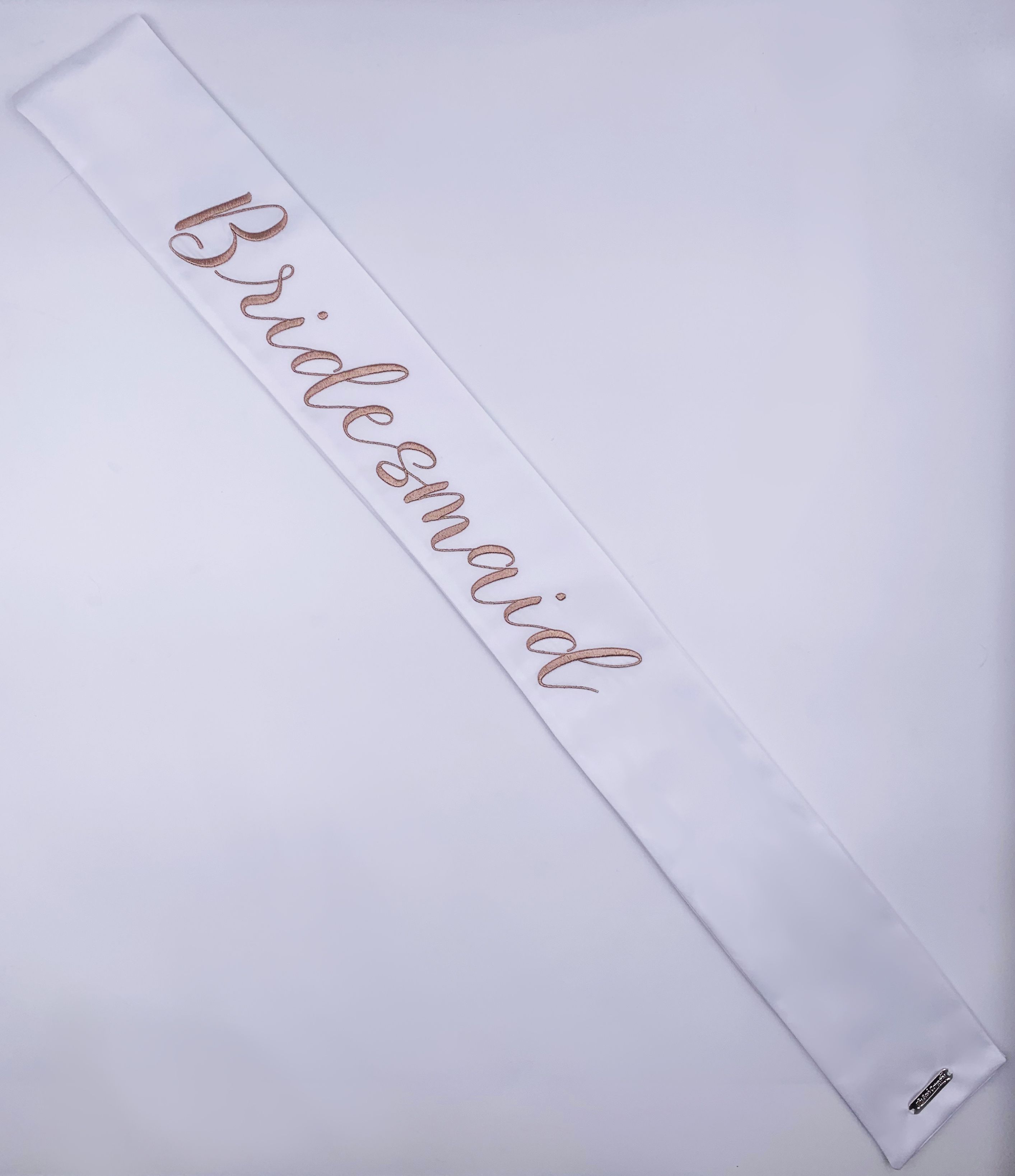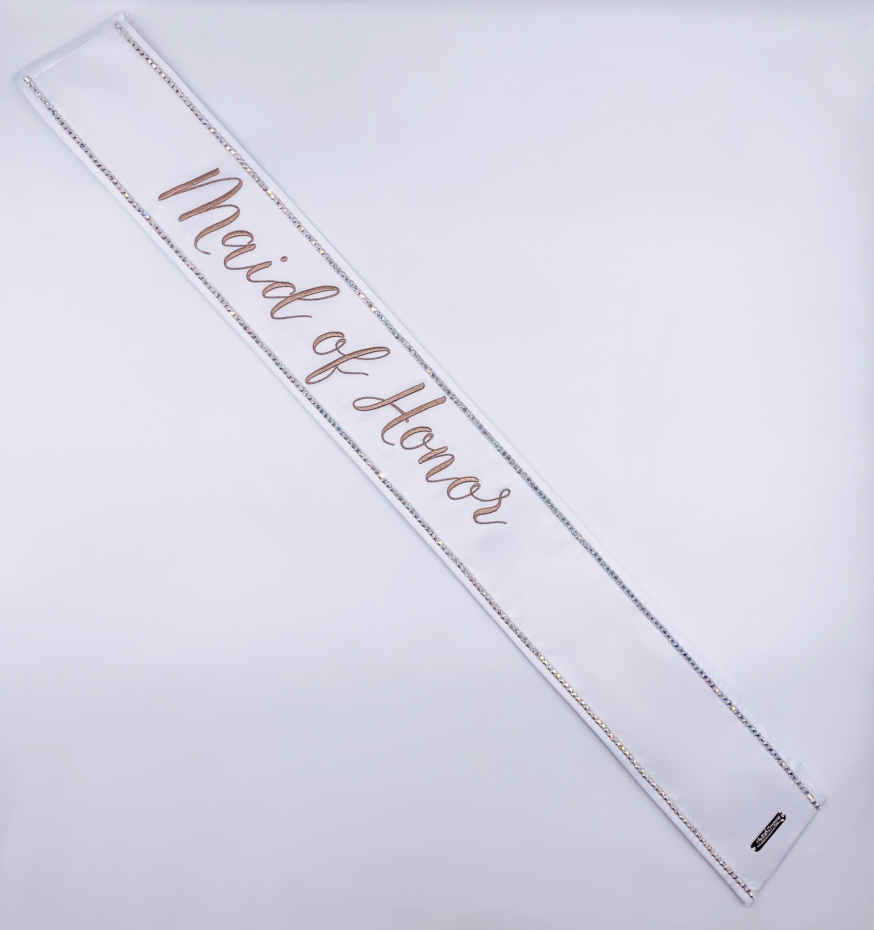 These modern and refined matching wedding party sashes are the ideal compliment to any of The Radiant Collection designed in collaboration with Miss California 2018 MacKenzie Freed! Make sure the entire wedding party from bridesmaids to flower girls to the maid of honor or matron of honor can stand out while celebrating your shower, bachelorette party, rehearsal dinner, or any other wedding related get together! Embroidered in rose gold on a white sash and single row of Swarovski Crystals around the border.
