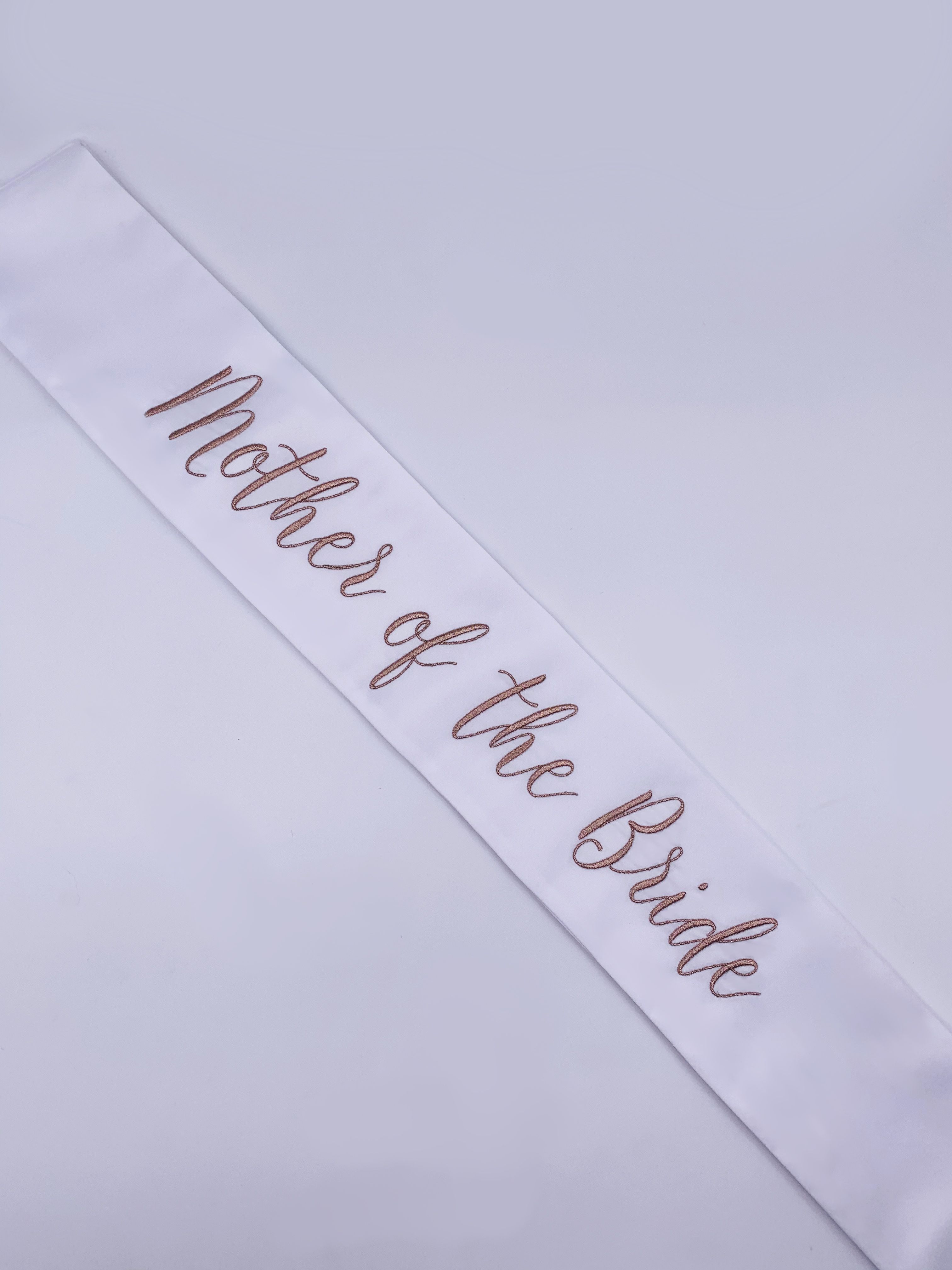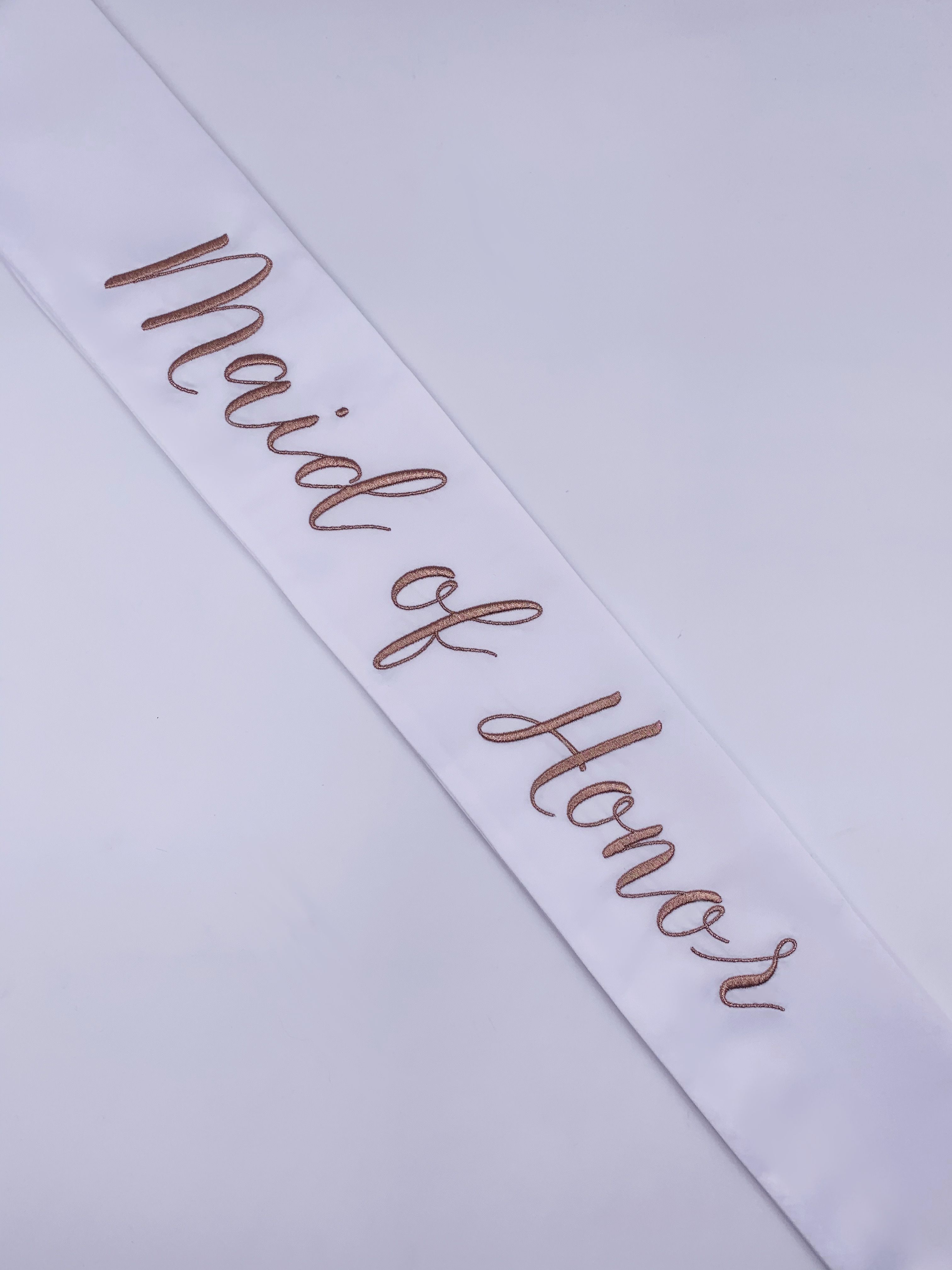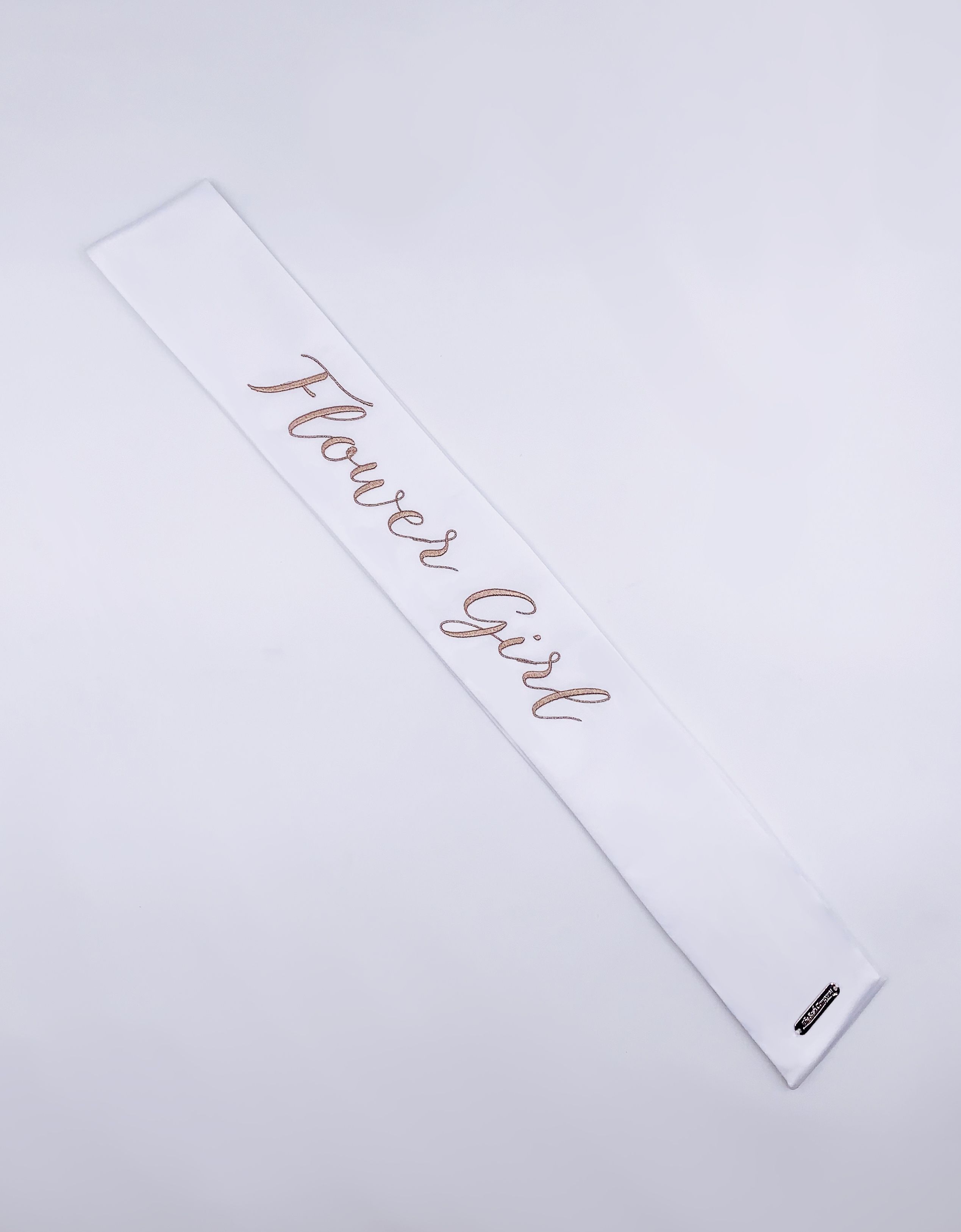 These modern and refined matching wedding party sashes are the ideal compliment to any of The Radiant Collection designed in collaboration with Miss California 2018 MacKenzie Freed! Make sure the entire wedding party from bridesmaids to flower girls to the maid of honor or matron of honor can stand out while celebrating your shower, bachelorette party, rehearsal dinner, or any other wedding related get together! Embroidered in rose gold on a white sash and single row of Swarovski Crystals around the border.