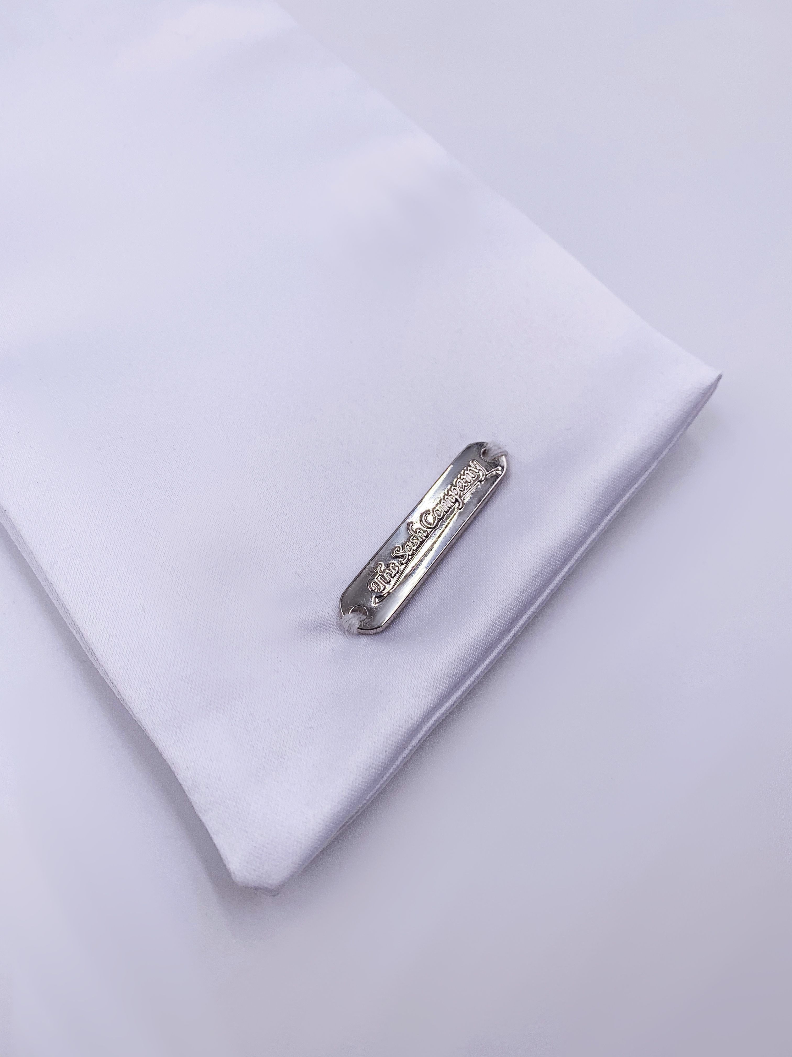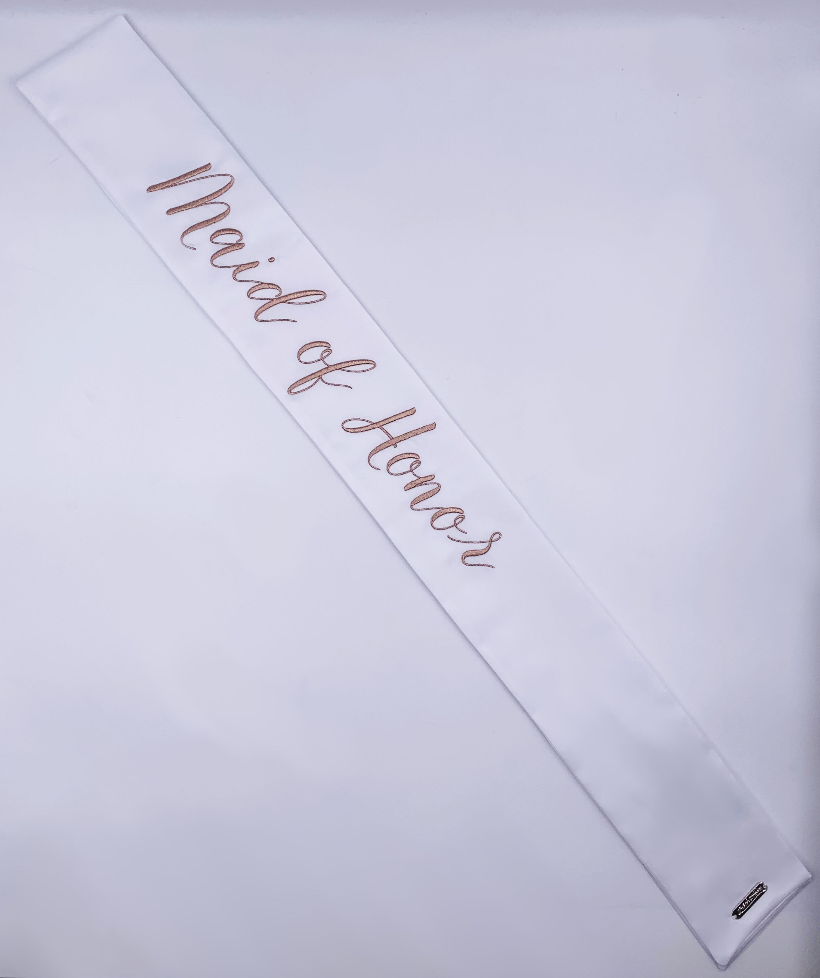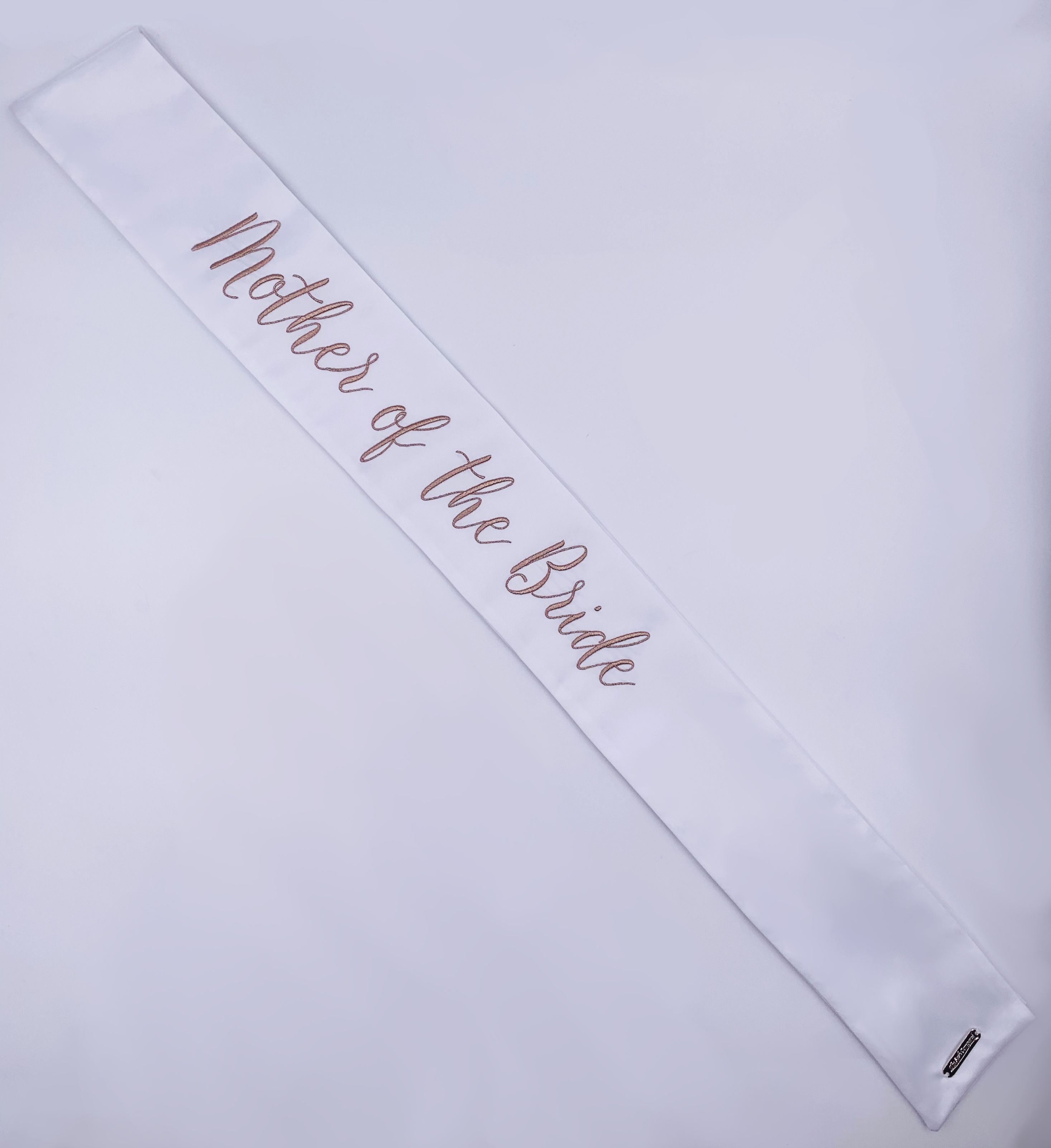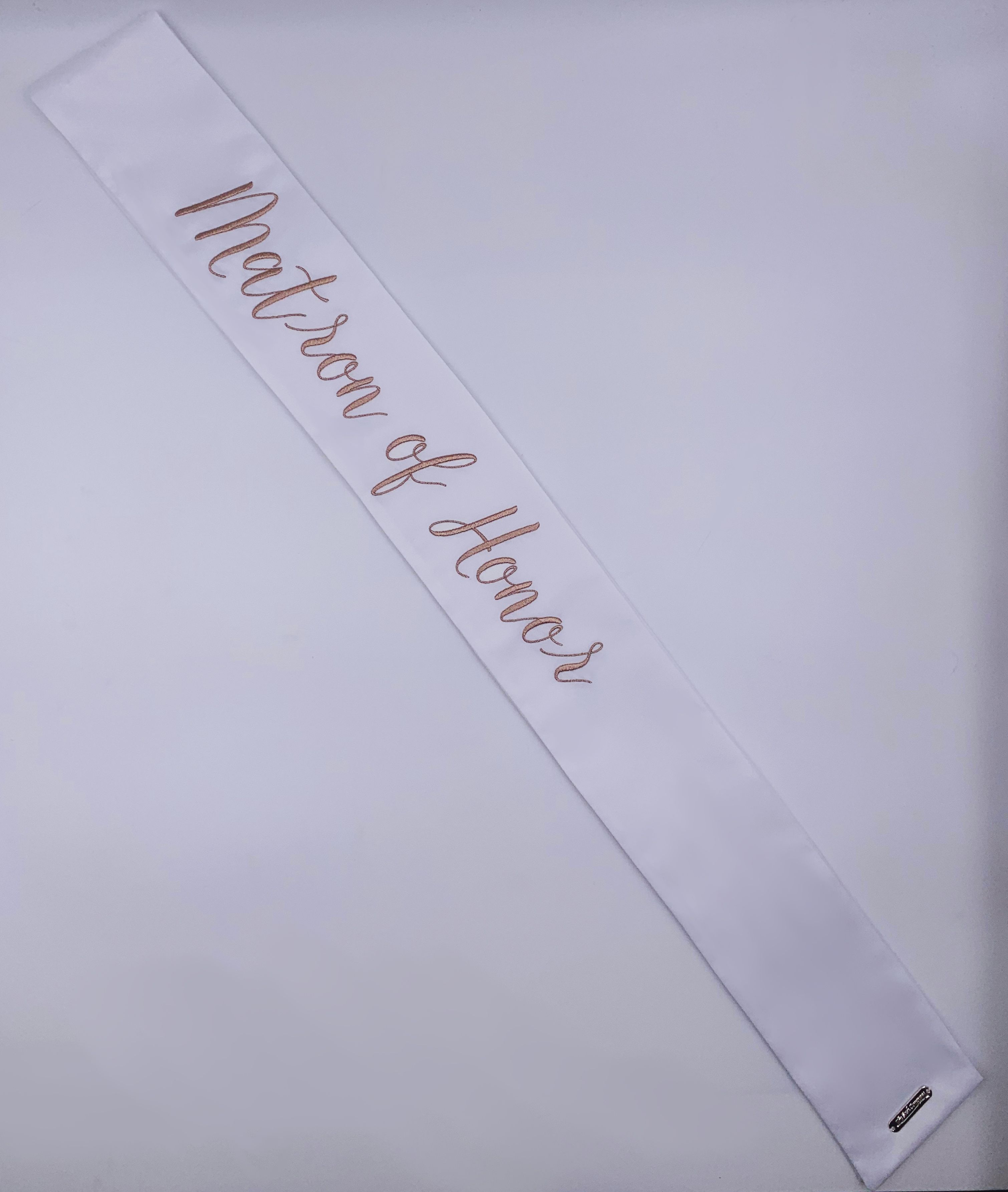 These modern and refined matching wedding party sashes are the ideal compliment to any of The Radiant Collection designed in collaboration with Miss California 2018 MacKenzie Freed! Make sure the entire wedding party from bridesmaids to flower girls to the maid of honor or matron of honor can stand out while celebrating your shower, bachelorette party, rehearsal dinner, or any other wedding related get together! Embroidered in rose gold on a white sash and single row of Swarovski Crystals around the border.