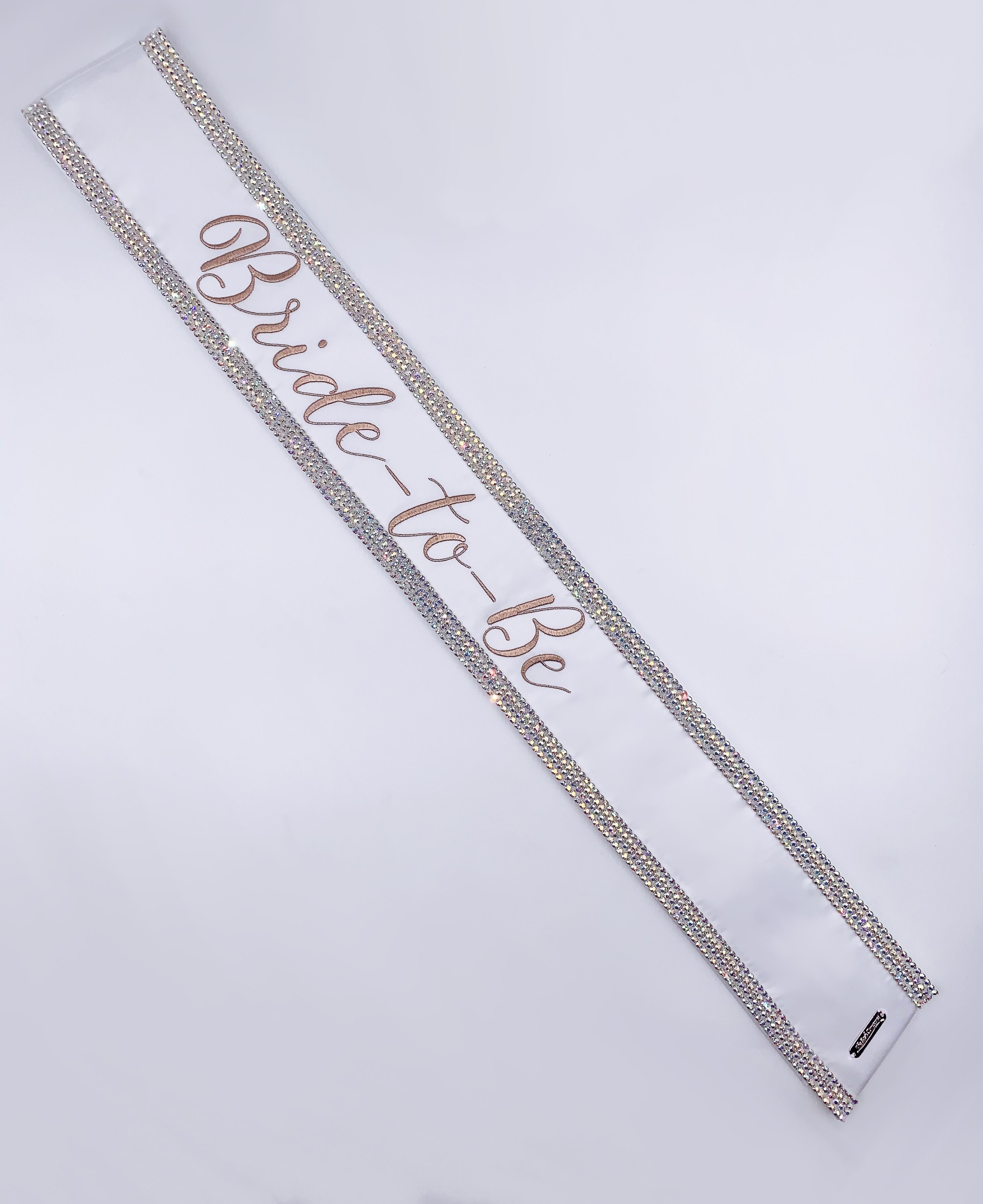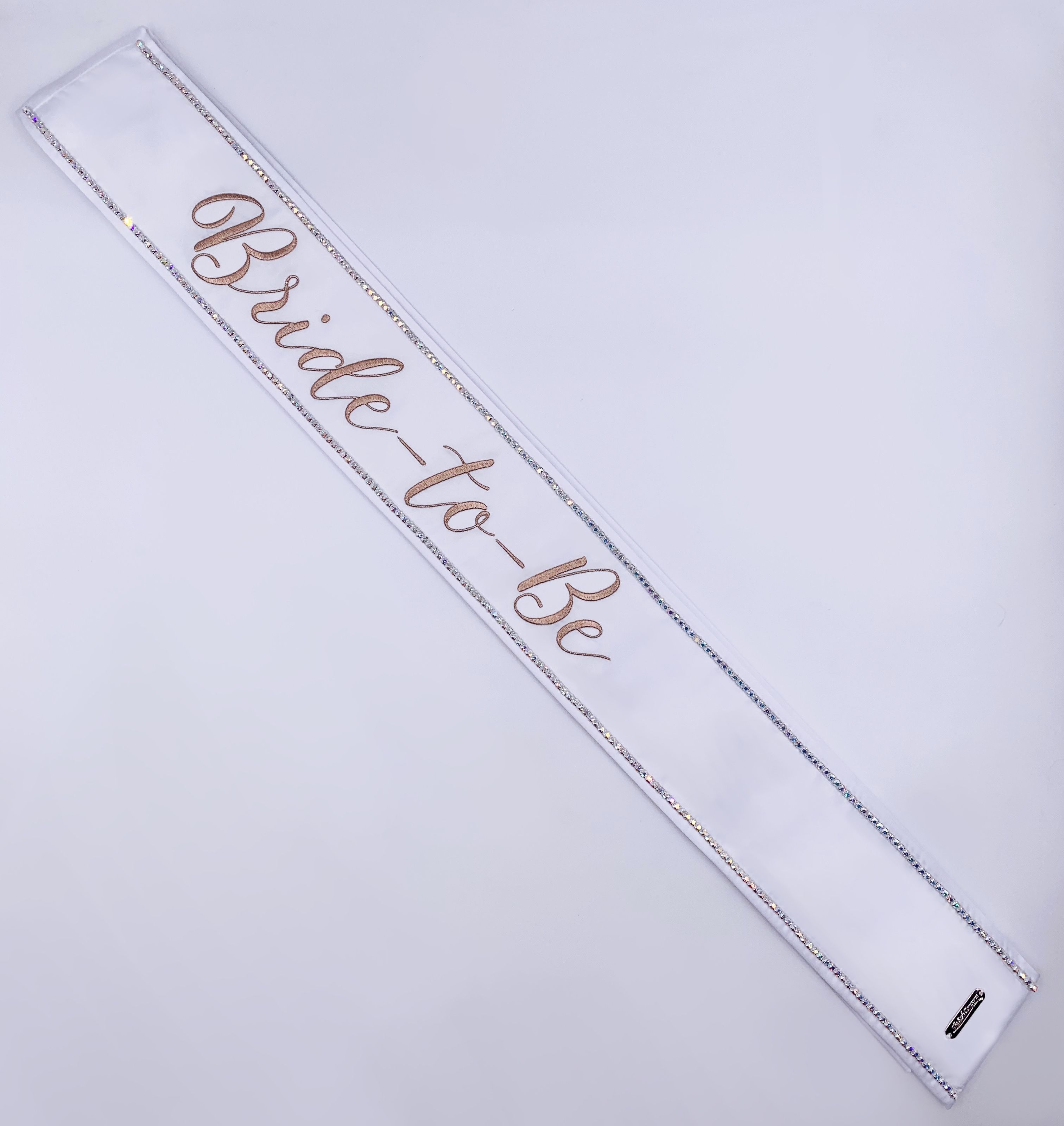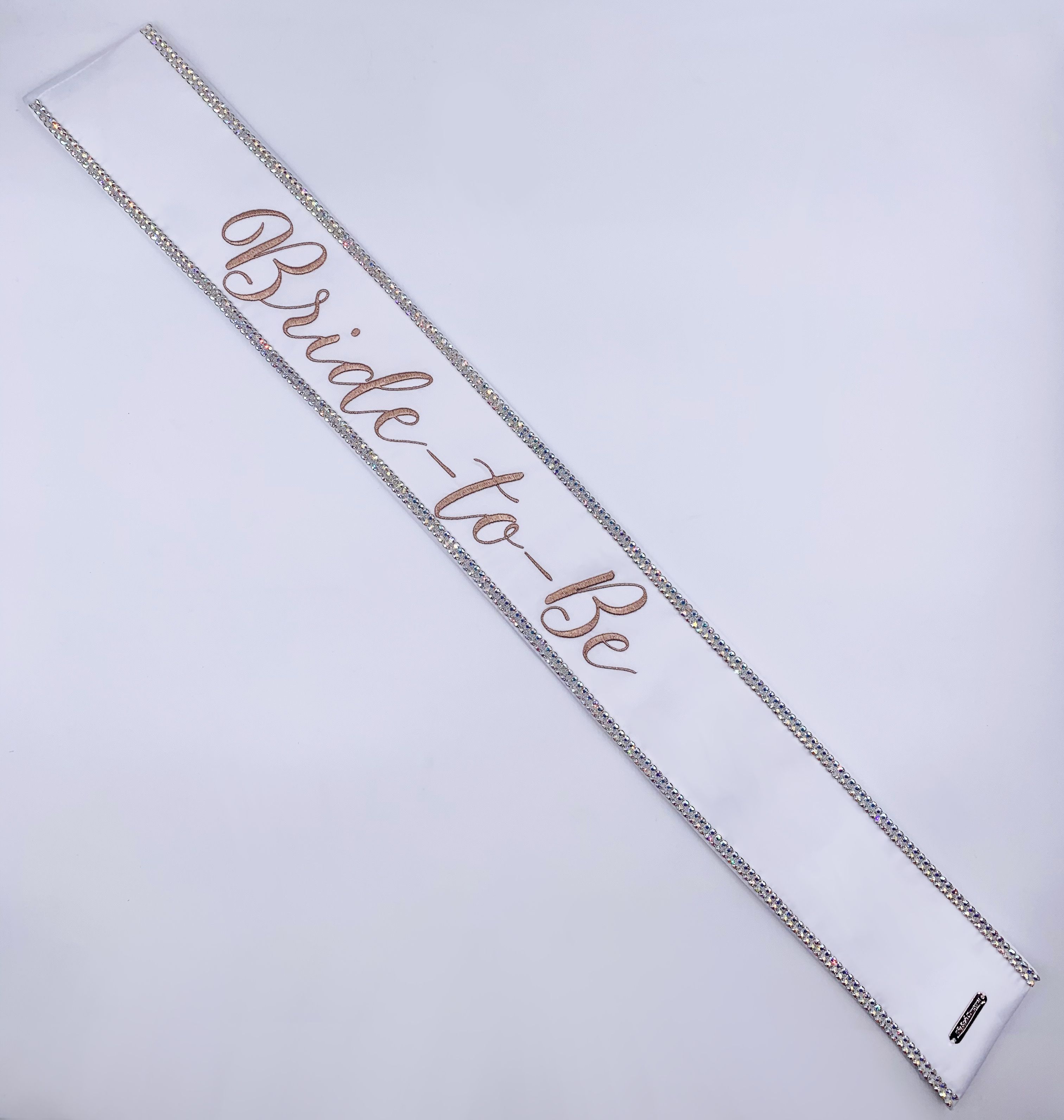 Designed by Miss California 2018, MacKenzie Freed! If you want to shine bright like a diamond from across the room at your bachelorette party or bridal shower you're in the right place. This Bride to Be Sash features an eye-catching four rows of hand-pressed AB rhinestones that sparkle rainbow on a white sash with trendy rose gold embroidery to make sure you and your wedding party are seen at your bridal shower, bachelorette party, or any other wedding related event!