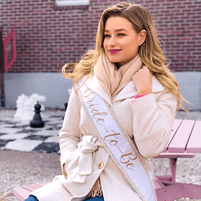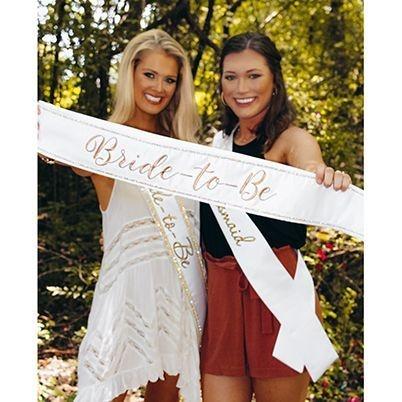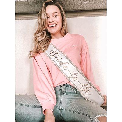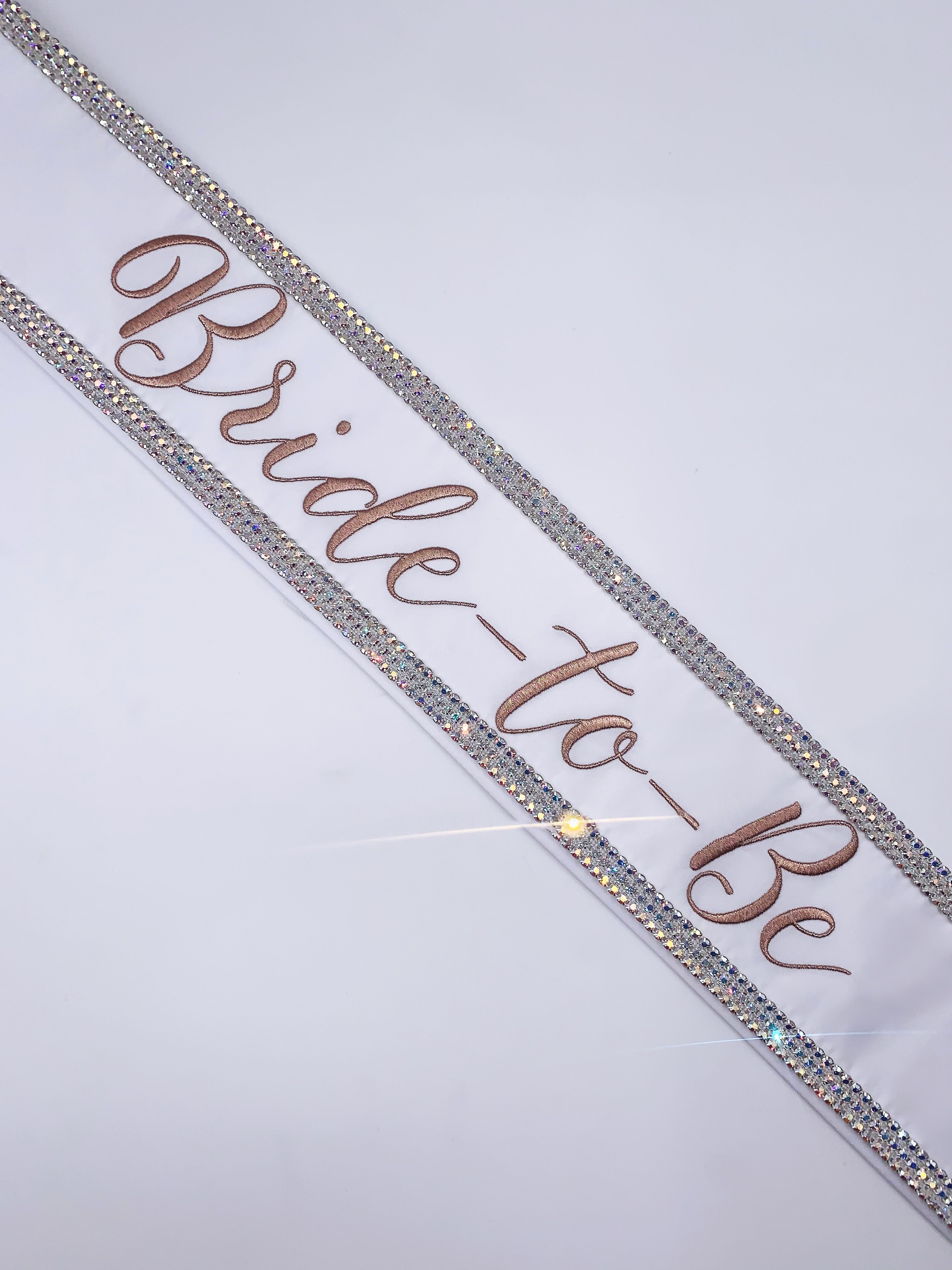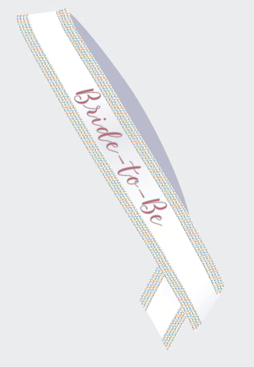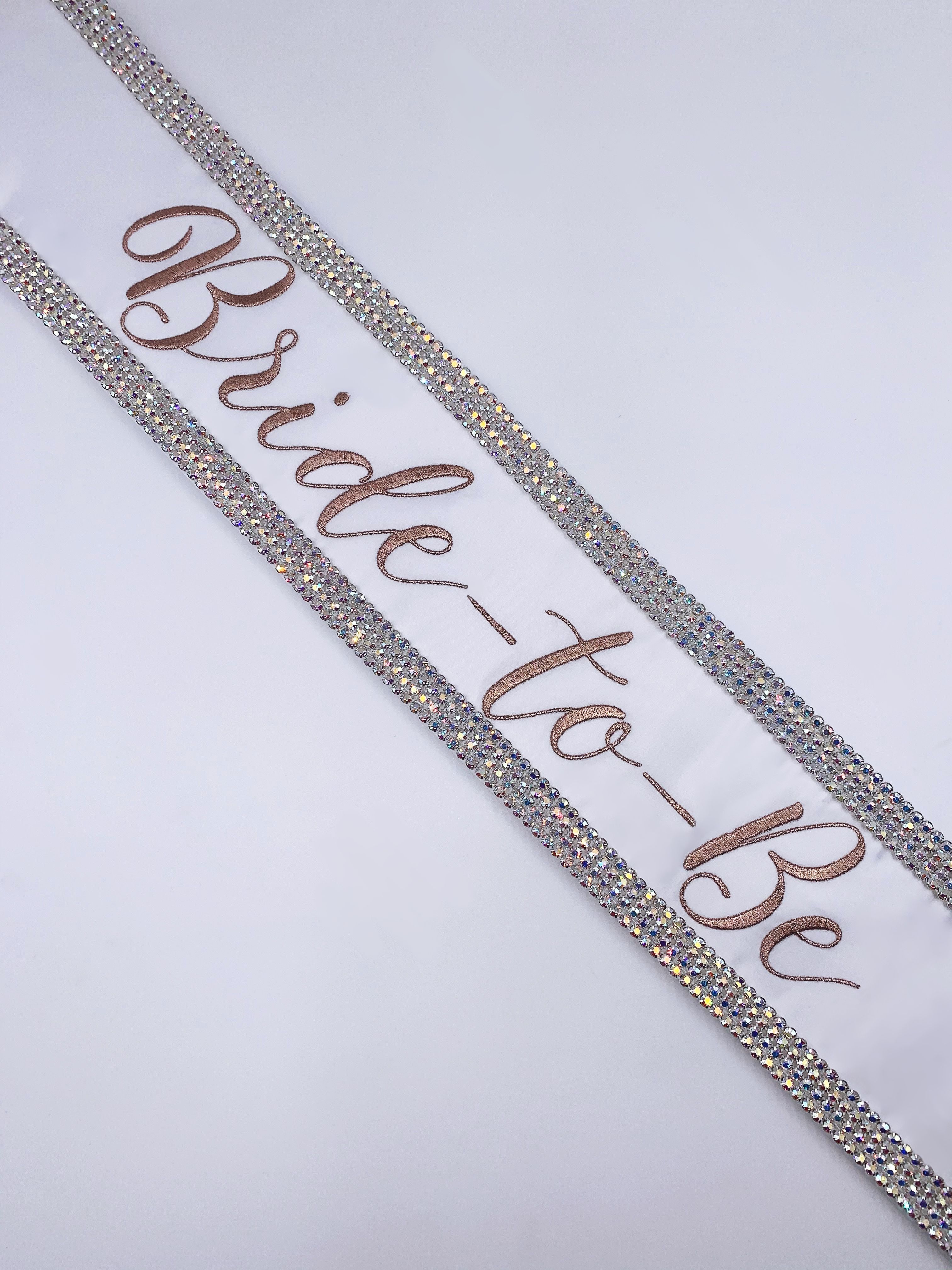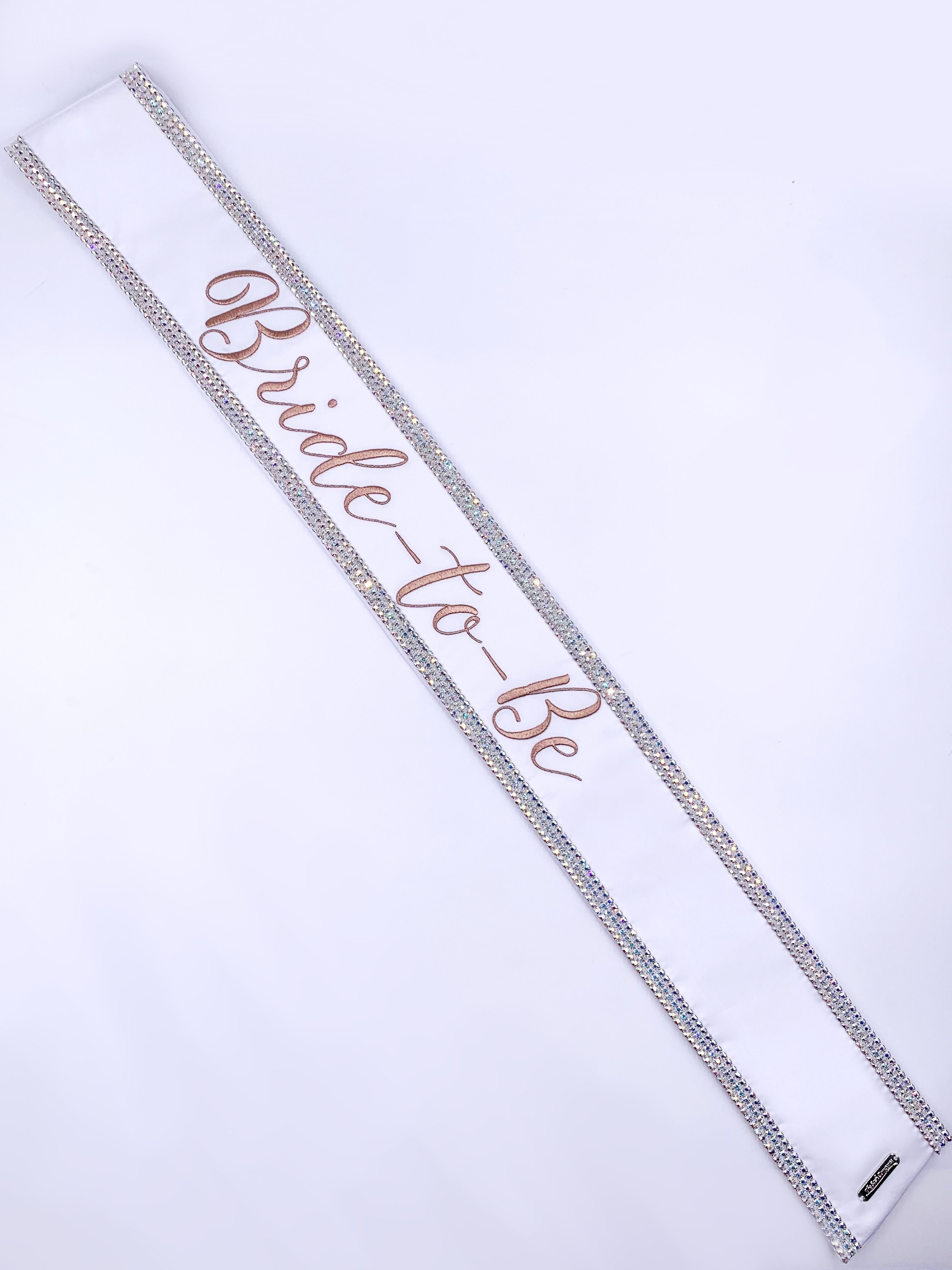 Designed by Miss California 2018, MacKenzie Freed! If you want to shine bright like a diamond from across the room at your bachelorette party or bridal shower you're in the right place. This Bride to Be Sash features an eye-catching four rows of hand-pressed AB rhinestones that sparkle rainbow on a white sash with trendy rose gold embroidery to make sure you and your wedding party are seen at your bridal shower, bachelorette party, or any other wedding related event!