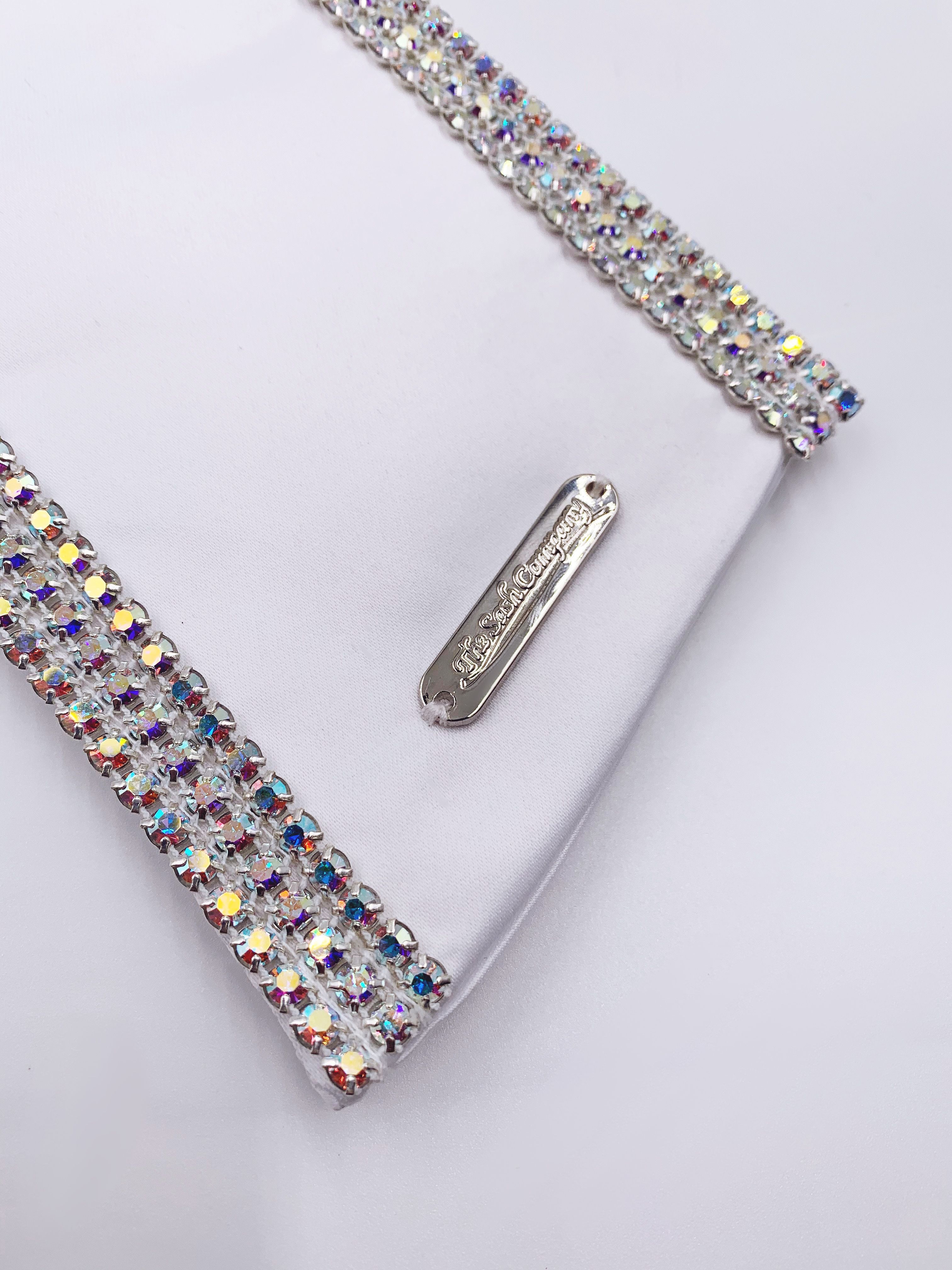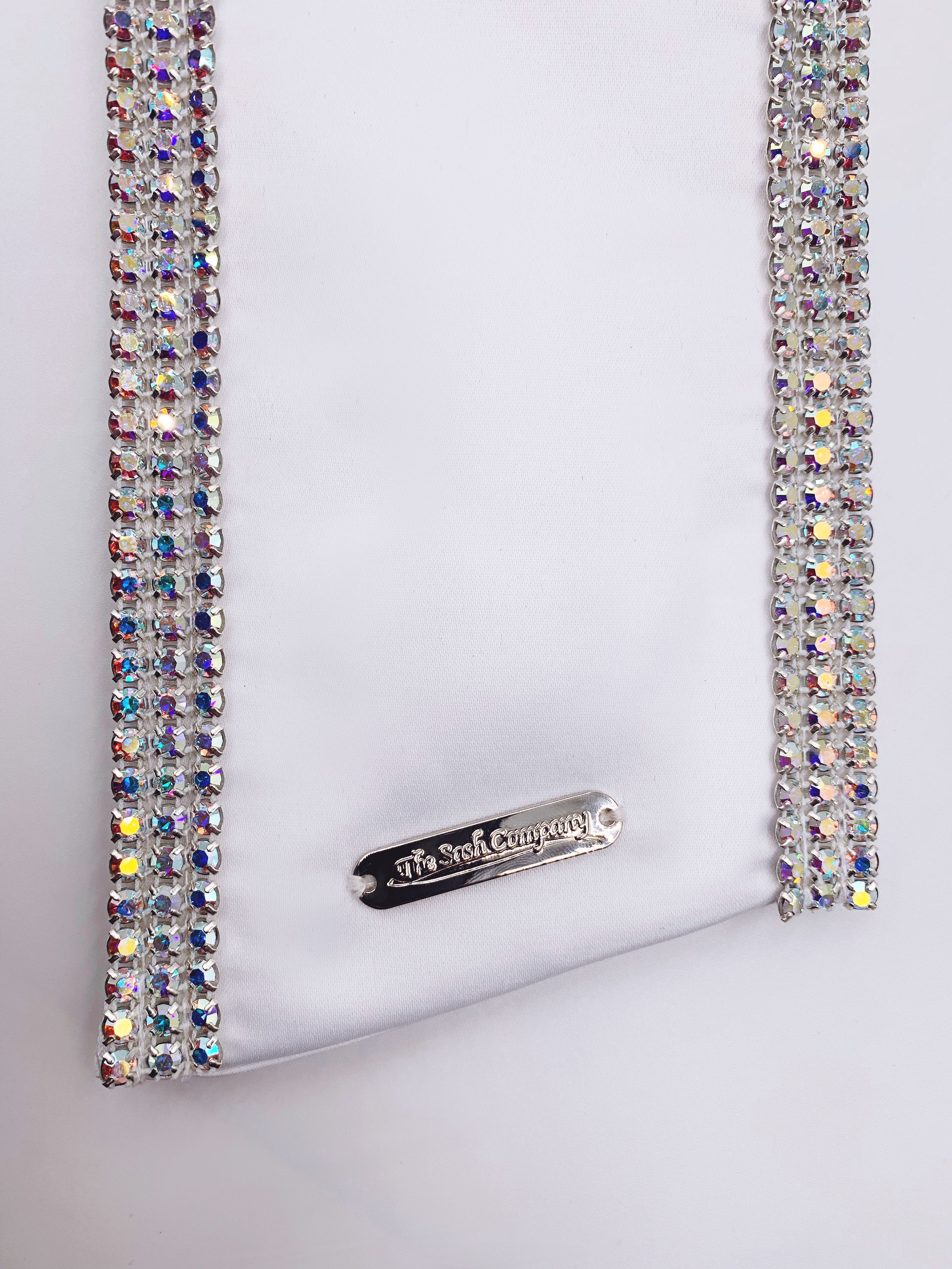 Designed by Miss California 2018, MacKenzie Freed! If you want to shine bright like a diamond from across the room you're in the right place. This sash features an eye-catching three rows of hand-pressed white rhinestones on a white sash with trendy rose gold embroidery to make sure your bride squad is seen! Because when only the best will do, The Sash Company makes it all about you.