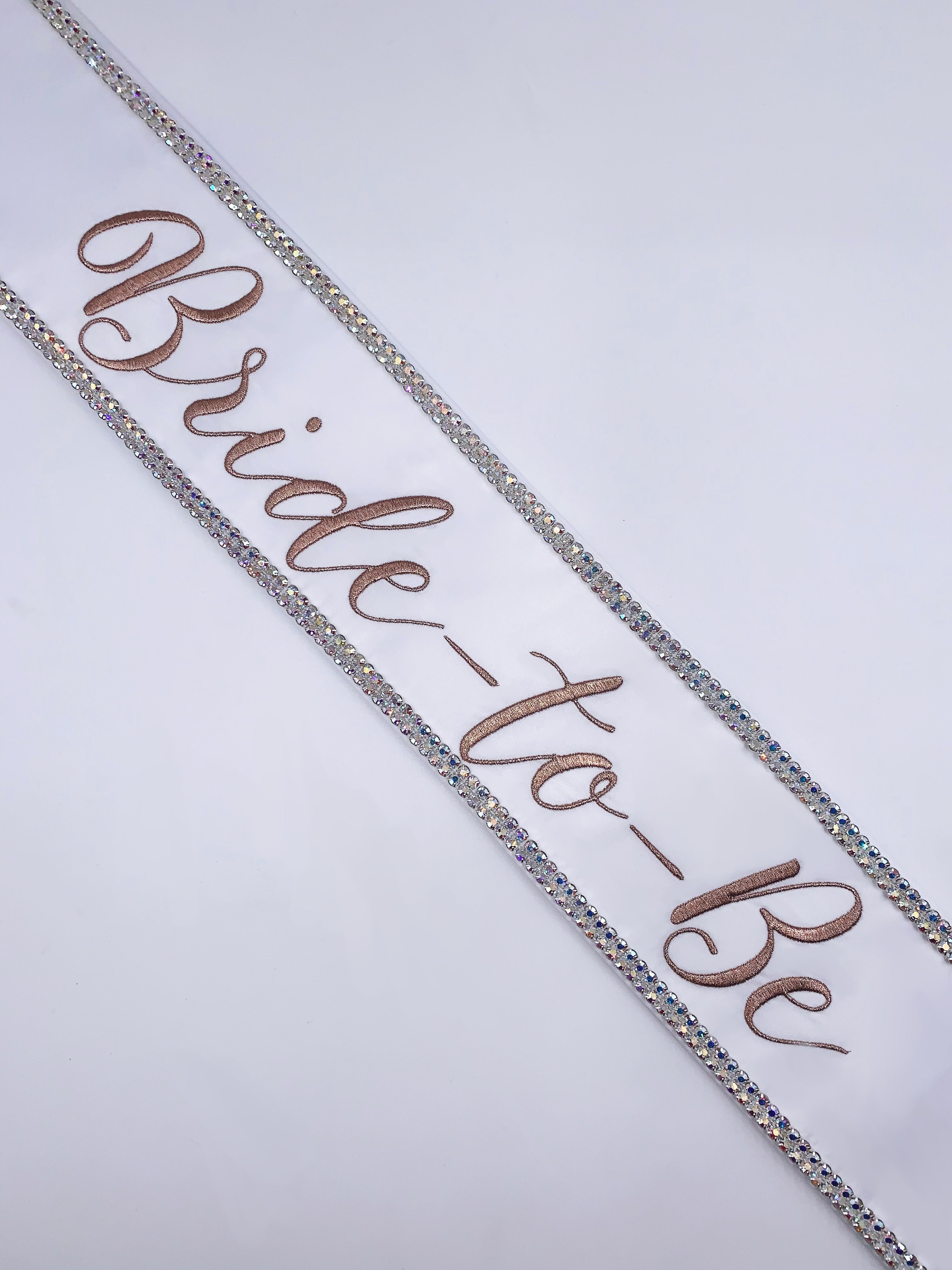 Designed by Miss California 2018, MacKenzie Freed! If you want to shine bright like a diamond from across the room you're in the right place. This sash features an eye-catching two rows of hand-pressed white rhinestones on a white sash with trendy rose gold embroidery to make sure your bride squad is seen! Because when only the best will do, The Sash Company makes it all about you.