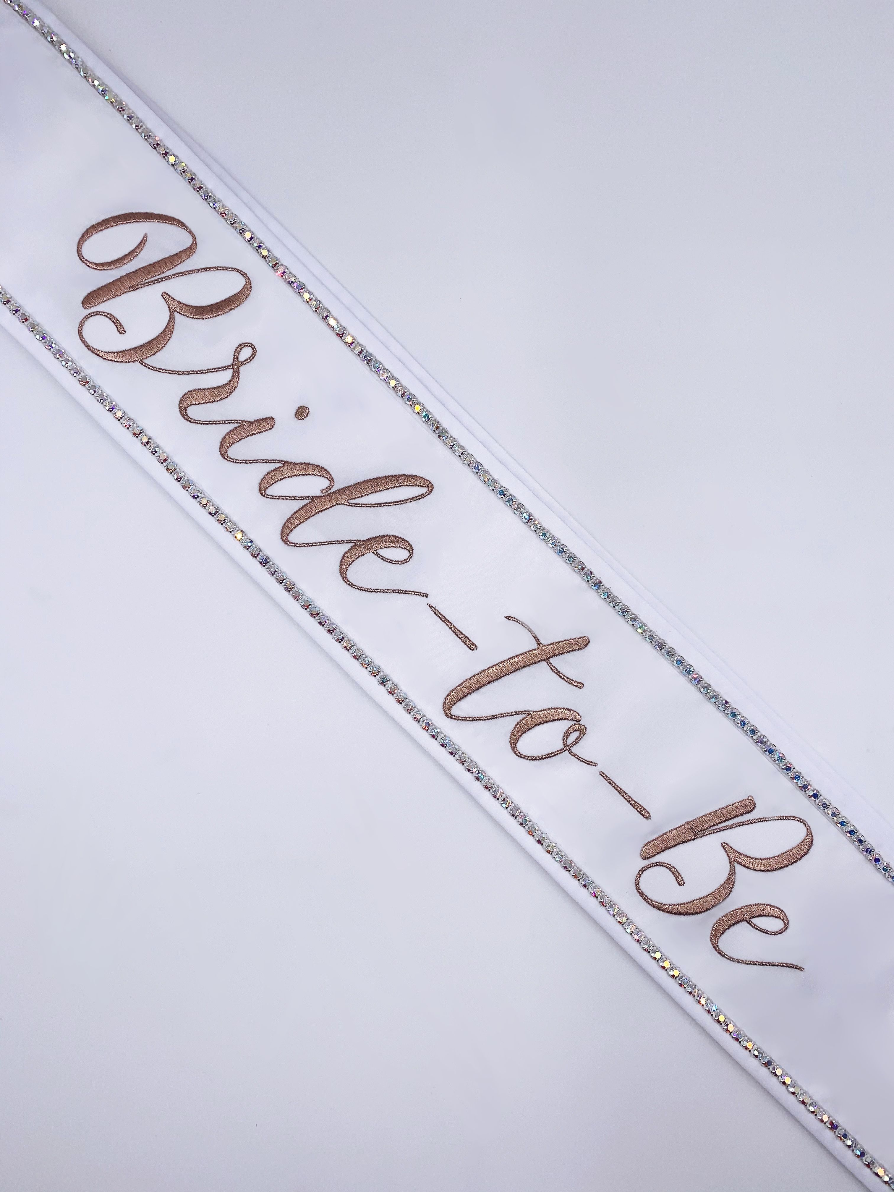 Designed by Miss California 2018, MacKenzie Freed! If you want to shine bright like a diamond from across the room you're in the right place. This sash features an eye-catching one row of hand-pressed white rhinestones on a white sash with trendy rose gold embroidery to make sure your bride squad is seen! Because when only the best will do, The Sash Company makes it all about you.