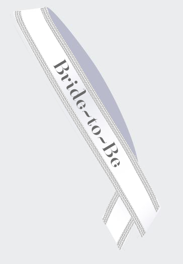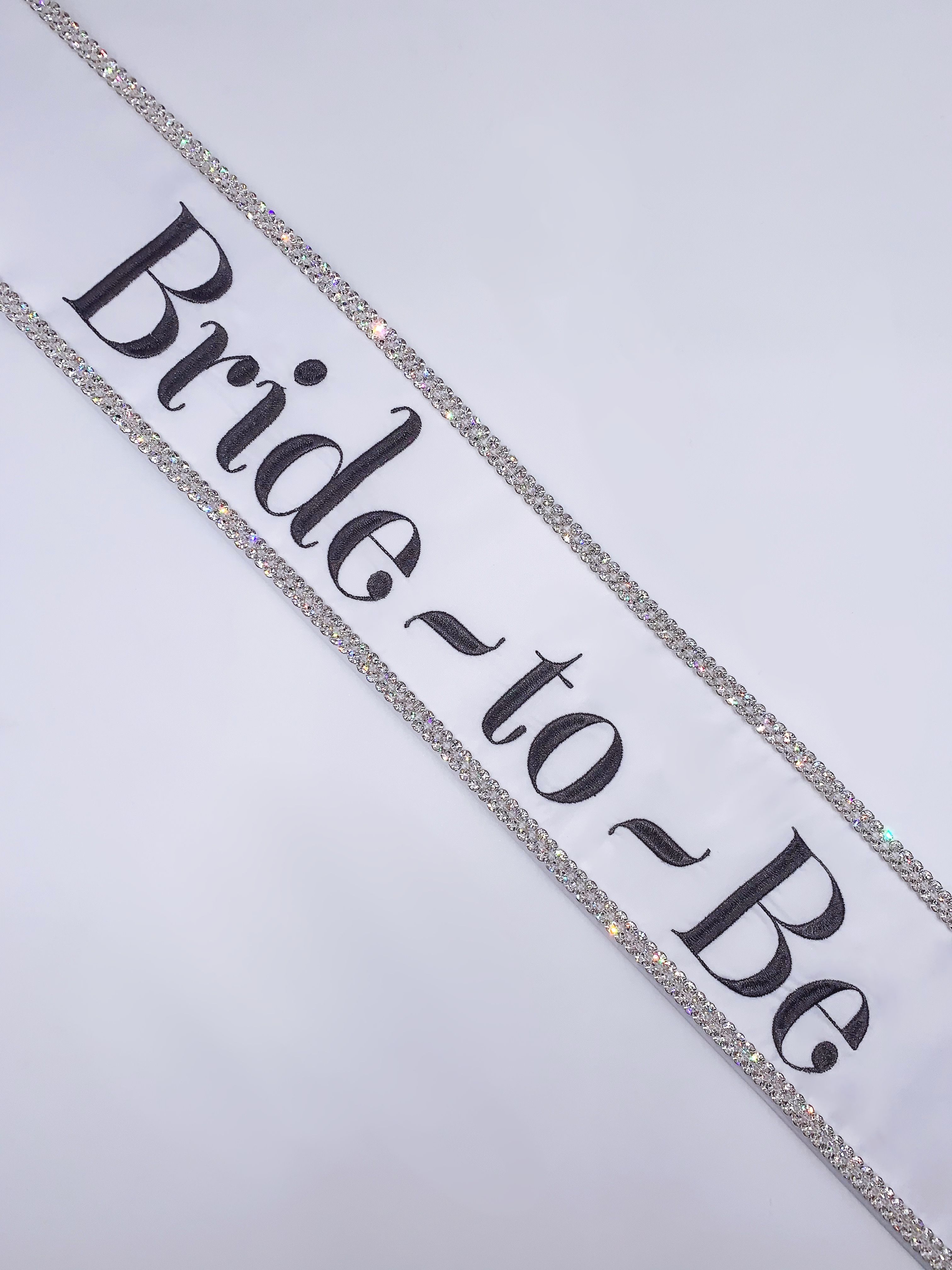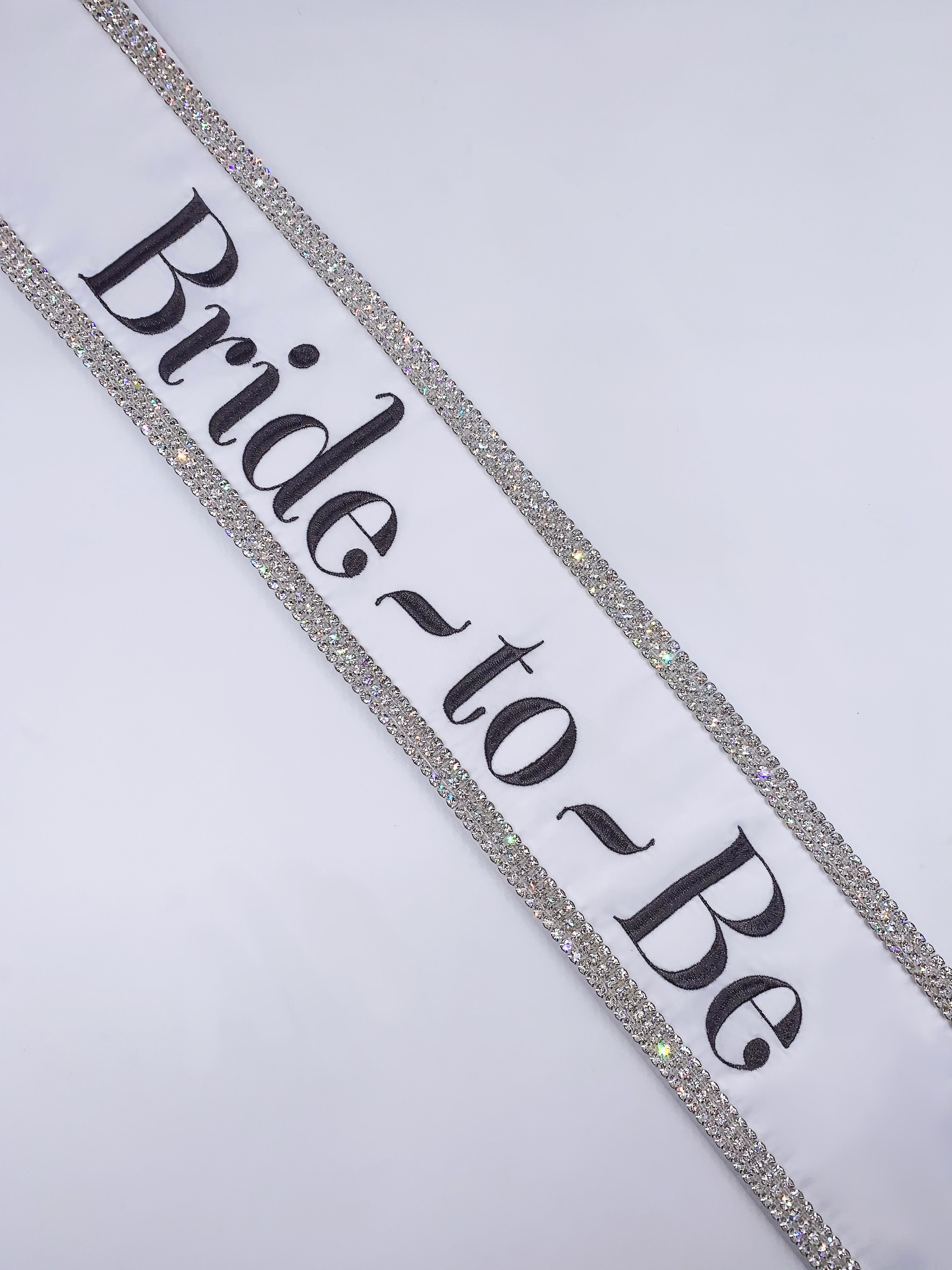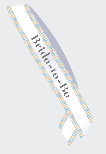 Celebrate your special day with our Graphite on White 'Bride to Be' Sash with two rows of white rhinestones. These gems are so bright you'll be seen from across the room by your glow alone!