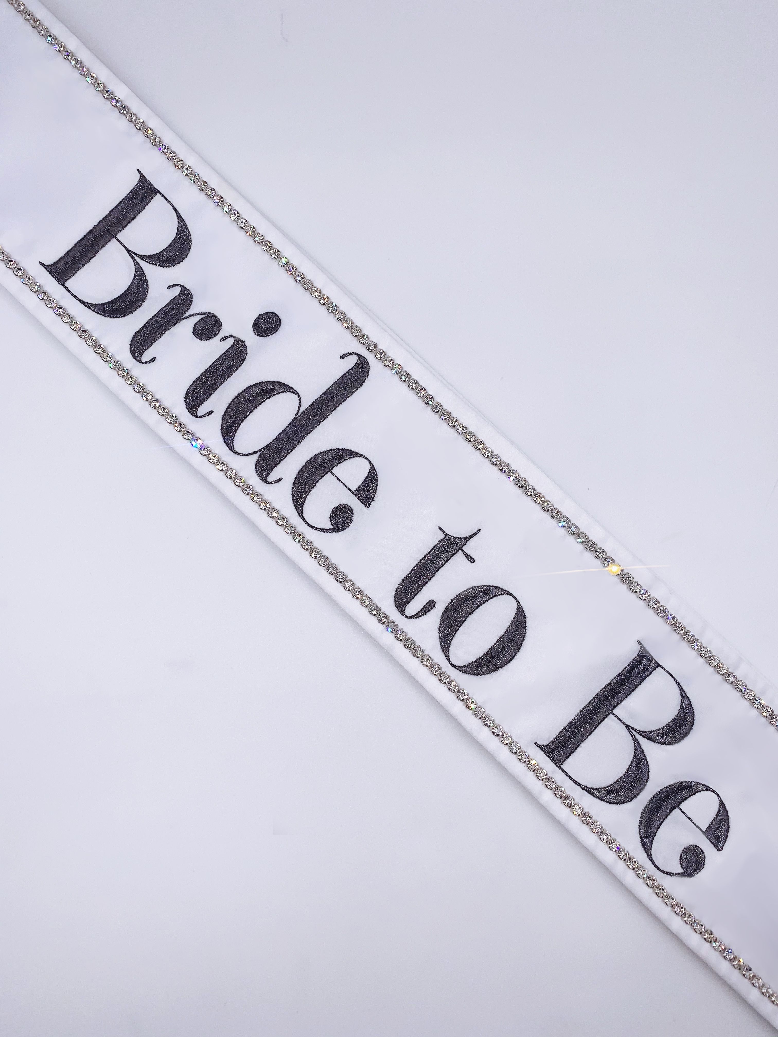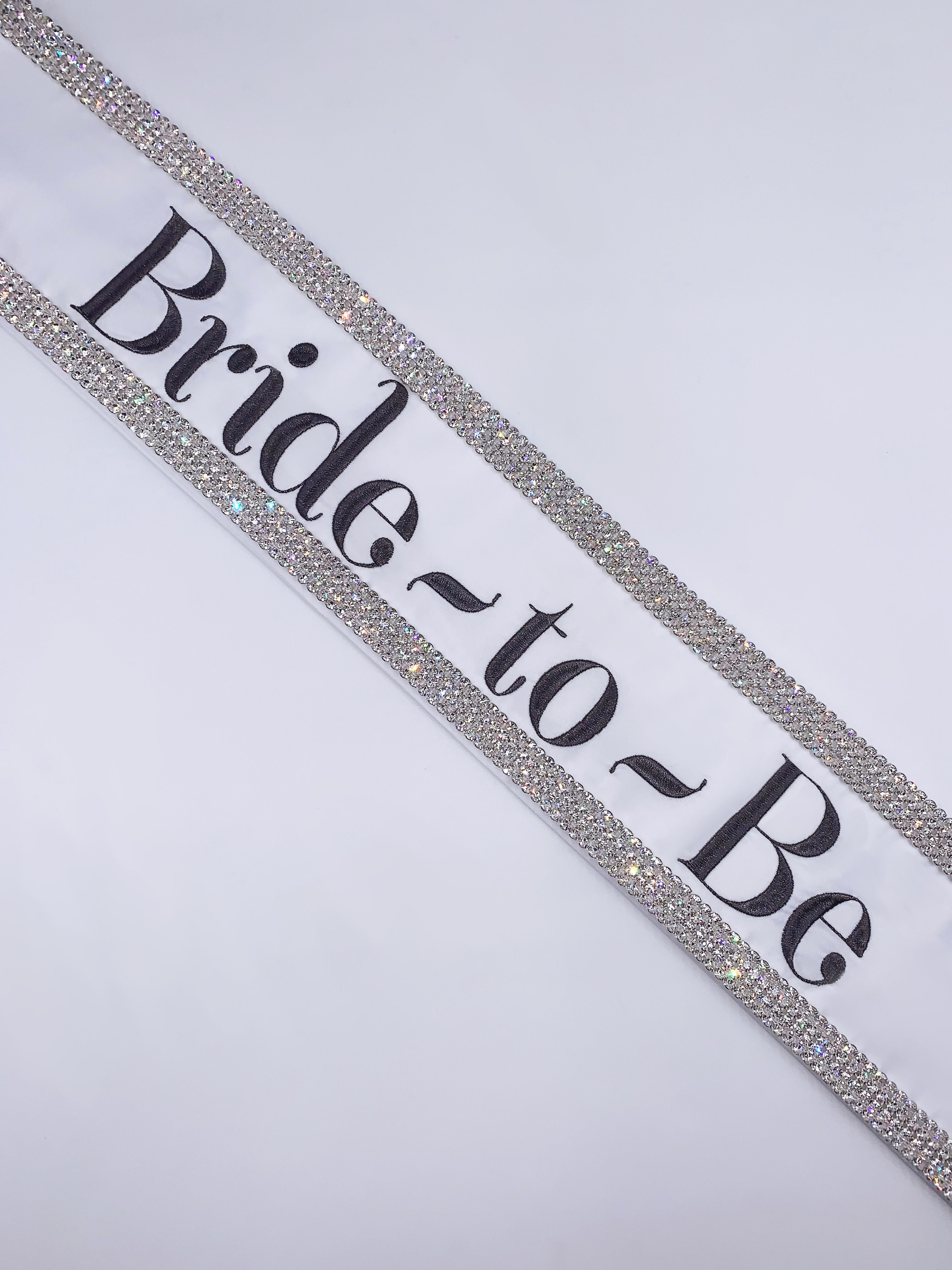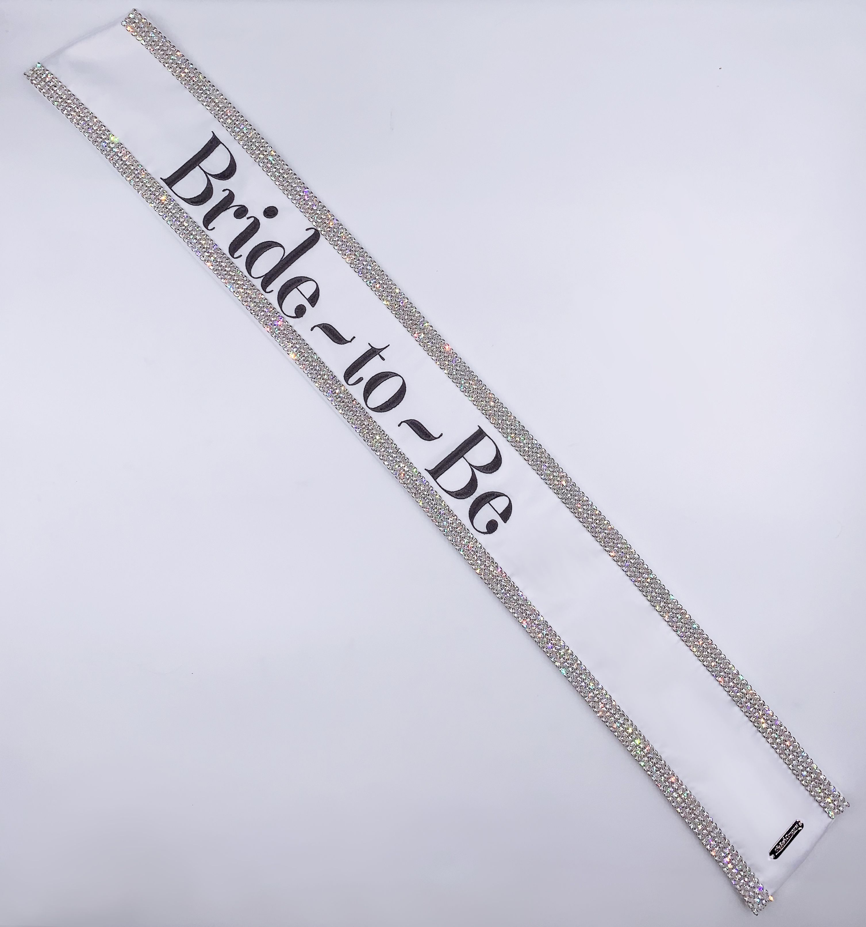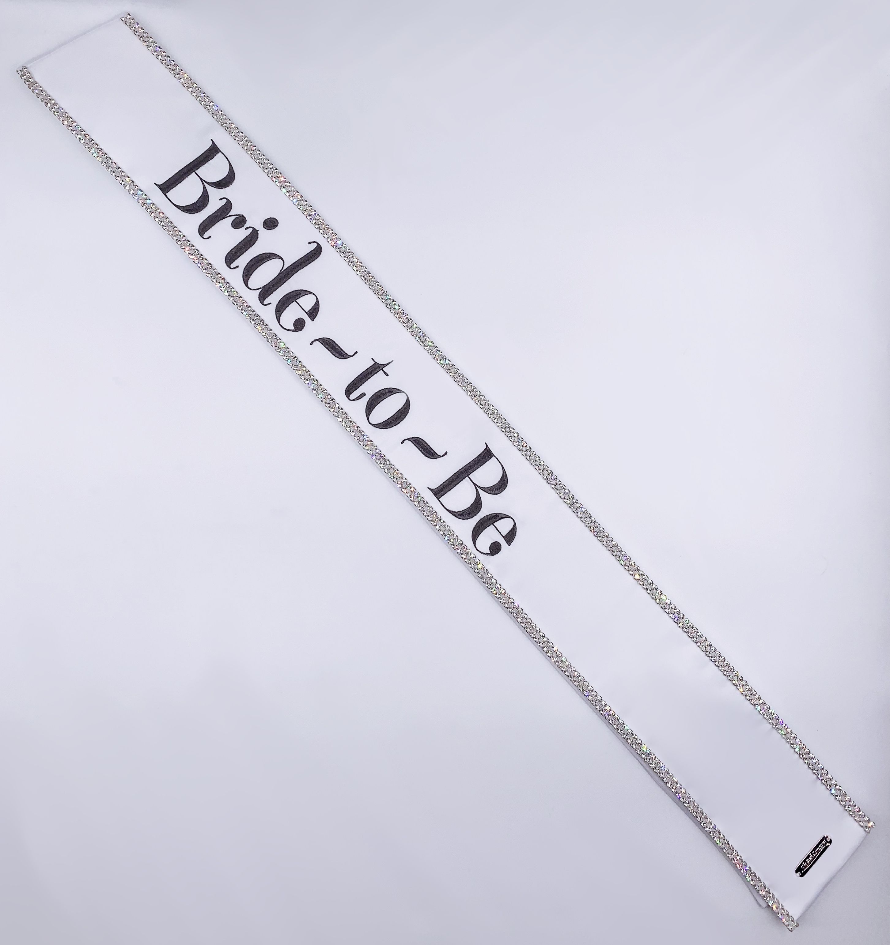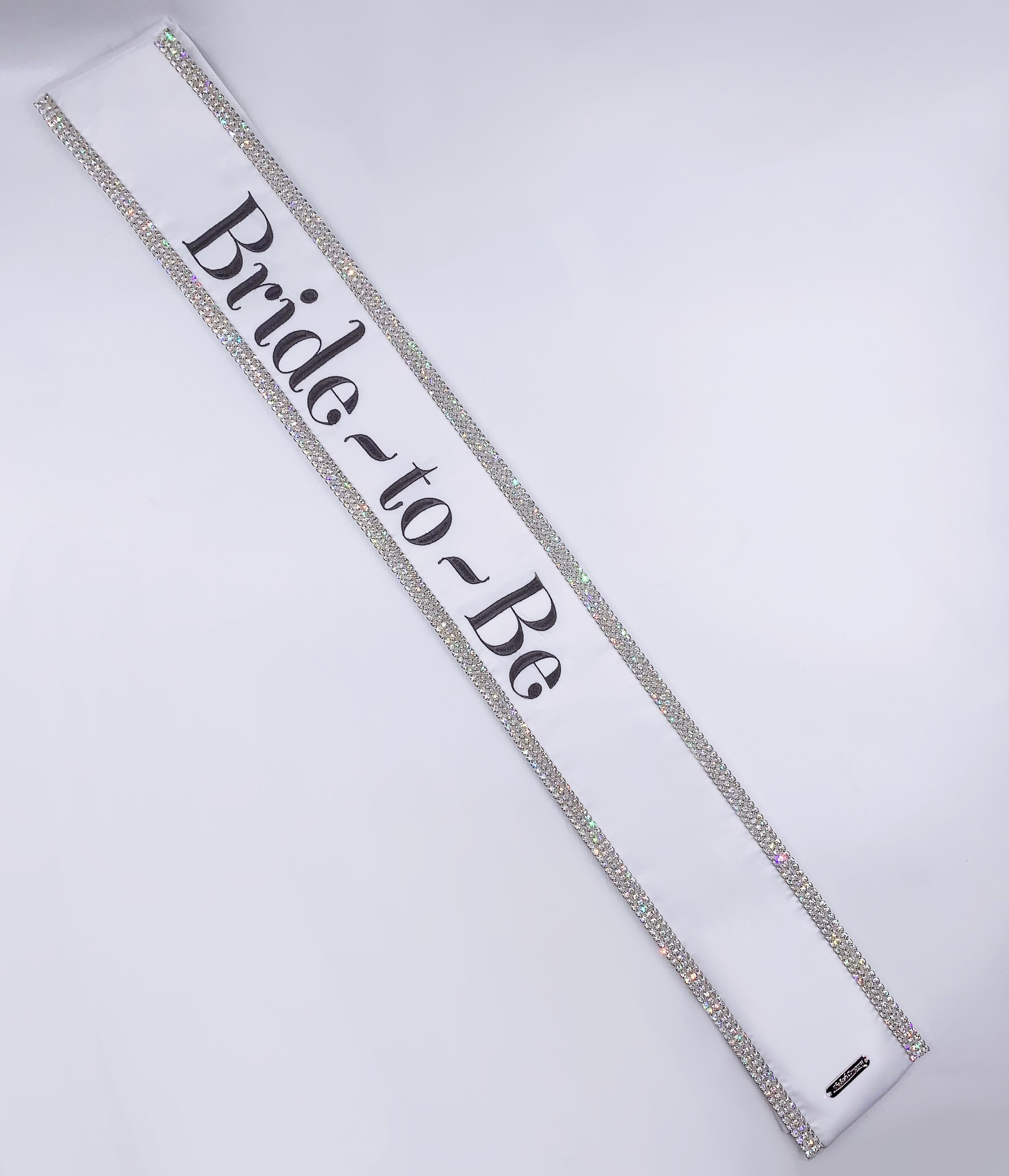 Celebrate your special day with our Graphite on White 'Bride to Be' Sash with three rows of white rhinestones. These gems are so bright you'll be seen from across the room by your glow alone!