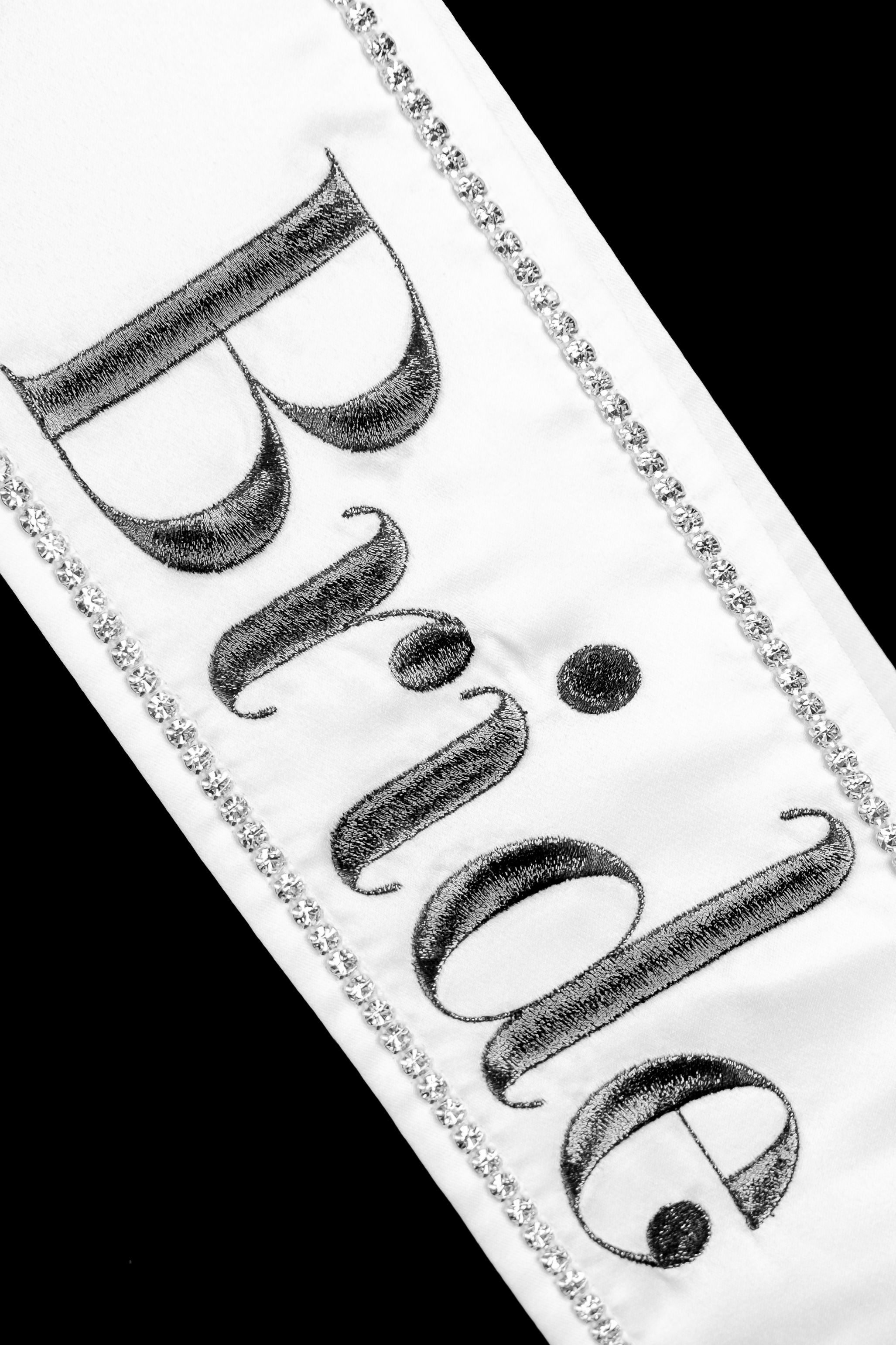 Celebrate your bachelorette party, bridal shower, or any other wedding related event with our Graphite on White Bridal Sash for a Bride to Be with four rows of silver-backed white Swarovski Crystal rhinestones. These gems are so bright you'll be seen from across the room!