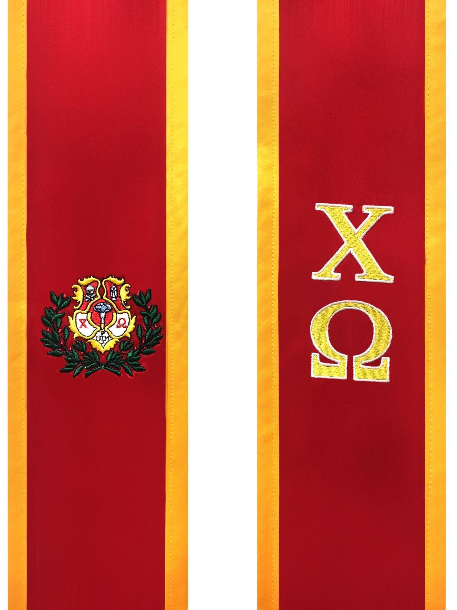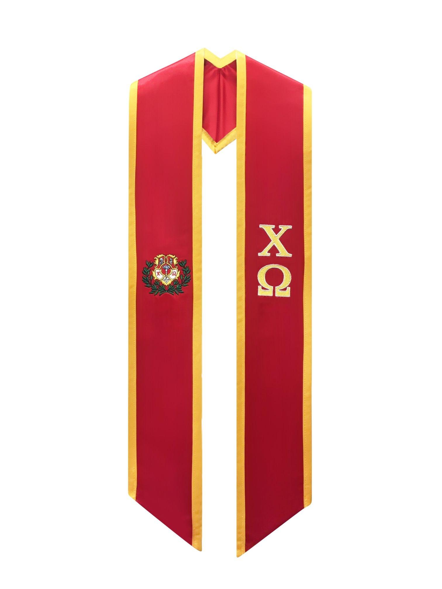 This graduation sash is custom made from the highest quality Japanese Satin with the Chi Omega Women's Sorority Greek lettering and official Coat of Arms. Each one we produce is handmade, professionally embroidered and chiseled cut, as well as Collegiate Officially Licensed using the official seal and colors. Share your Chi Omega pride!!