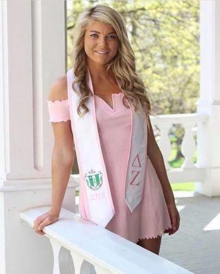 This Graduation Stole is custom made from Ultra Satin with the Delta Zeta Sorority Greek lettering and symbol logo. This handmade embroidered pointed cut Sorority Stole is officially licensed using the official seal and Sorority colors, personalized with your graduating year. Share your Delta Zeta pride!!