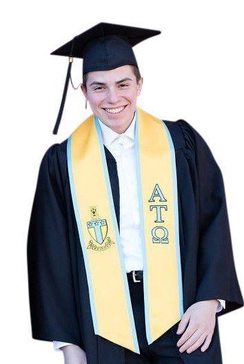 This Graduation Stole is custom made from Ultra Satin with the Alpha Tau Omega Fraternity Greek lettering and official Fraternity Crest. This handmade embroidered chiseled cut Fraternity Stole is an official collegiate licensed product with the official Coat of Arms and ATO colors. Show your Alpha Tau Omega Pride!!