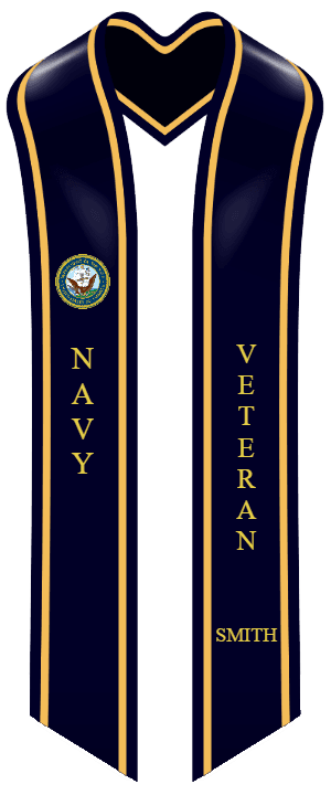 Honor your Navy Veteran with this handmade embroidered chiseled cut stole complete with the Navy Crest. This Navy Veteran Military Stole is custom made from navy blue ultra satin fabric with double borders, yellow trim. A global force for good.