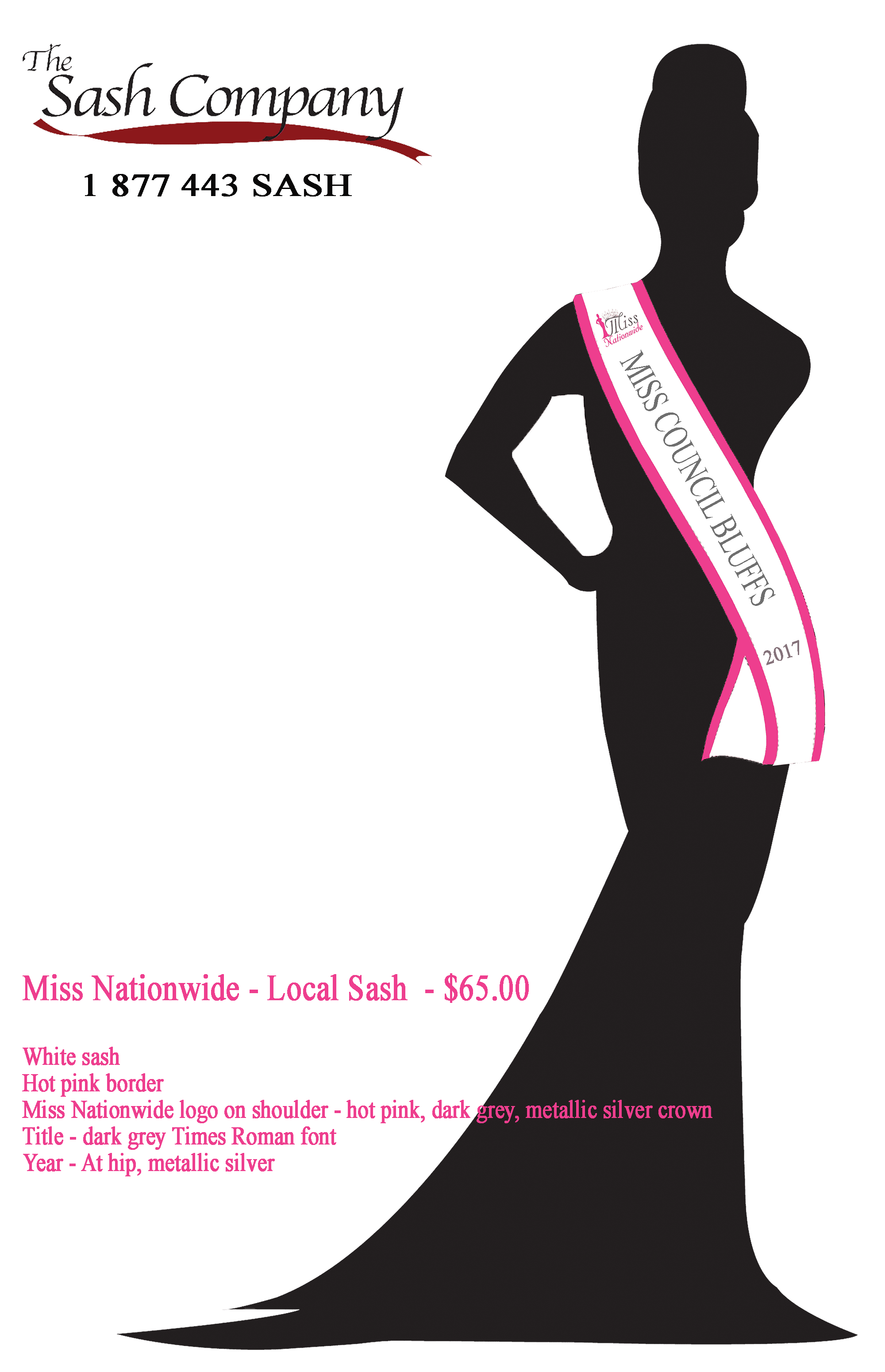 The branded elegance of the Miss & Mrs. Nationwide is echoed in all levels of their pageant and the local level sashes continue this. Embroidered at the shoulder with their logo, metallic silver title and accents, and hot pink border this local sash is just lovely!