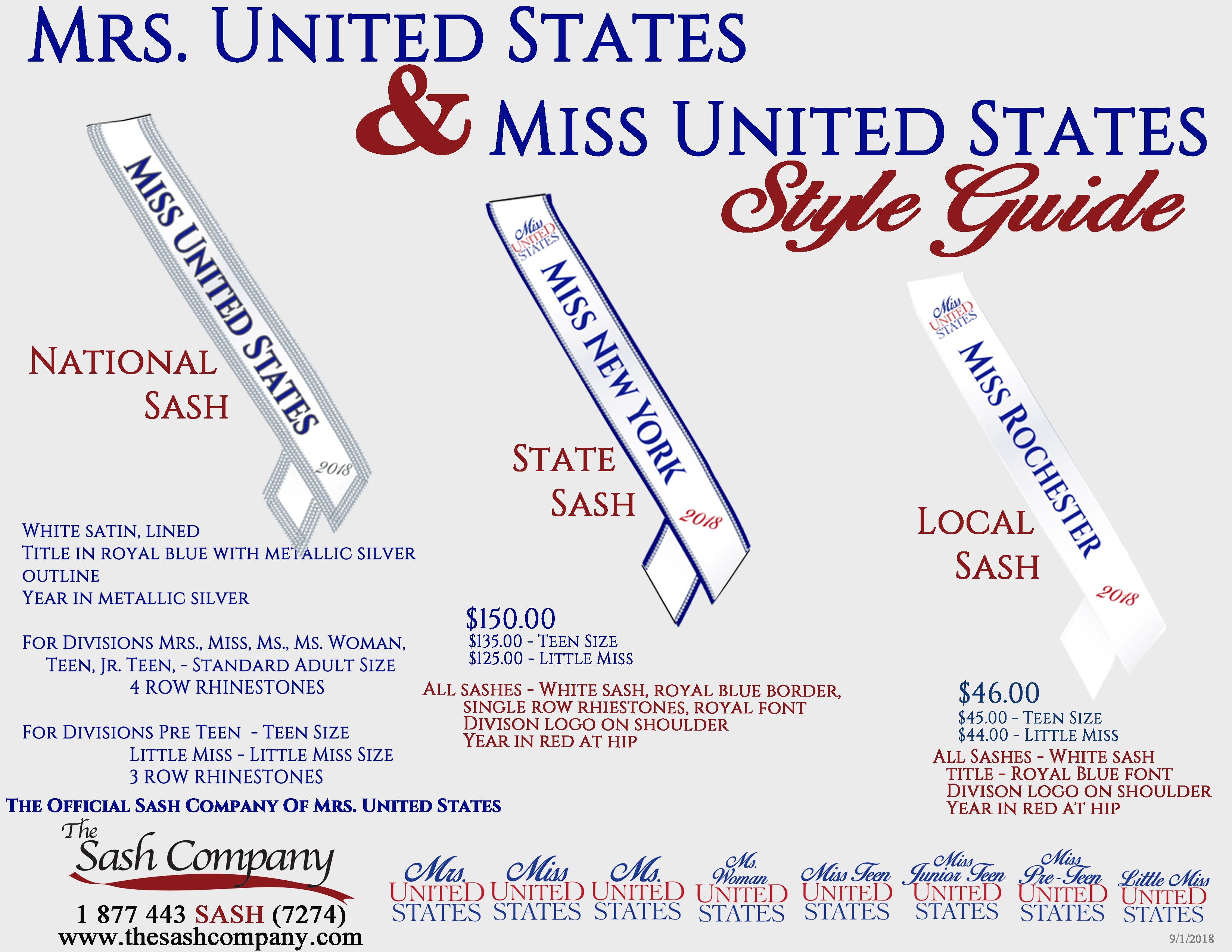 To represent your state wearing this Mrs. United States state sash is an honored accomplishment! With the logo finely embroidered on the shoulder, the state down the front, United States and year at the bottom.