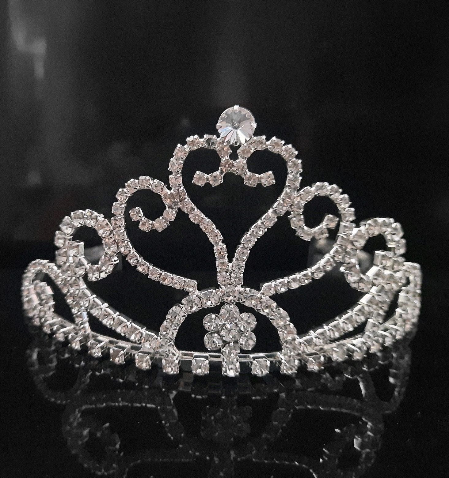The Bella is beautifully designed with a dangling crystal tear drop in the center of a rhinestone encrusted heart. This Bella Tiara Crown is perfect for pageants, homecoming and fit for a queen! Rhinestones adorn this Bella Tiara Crown set in plated sterling silver and holds in place with a comb on each end. Fits four year old's to adult. Measures 2" Tall x 5" Diameter.