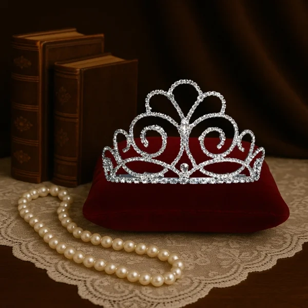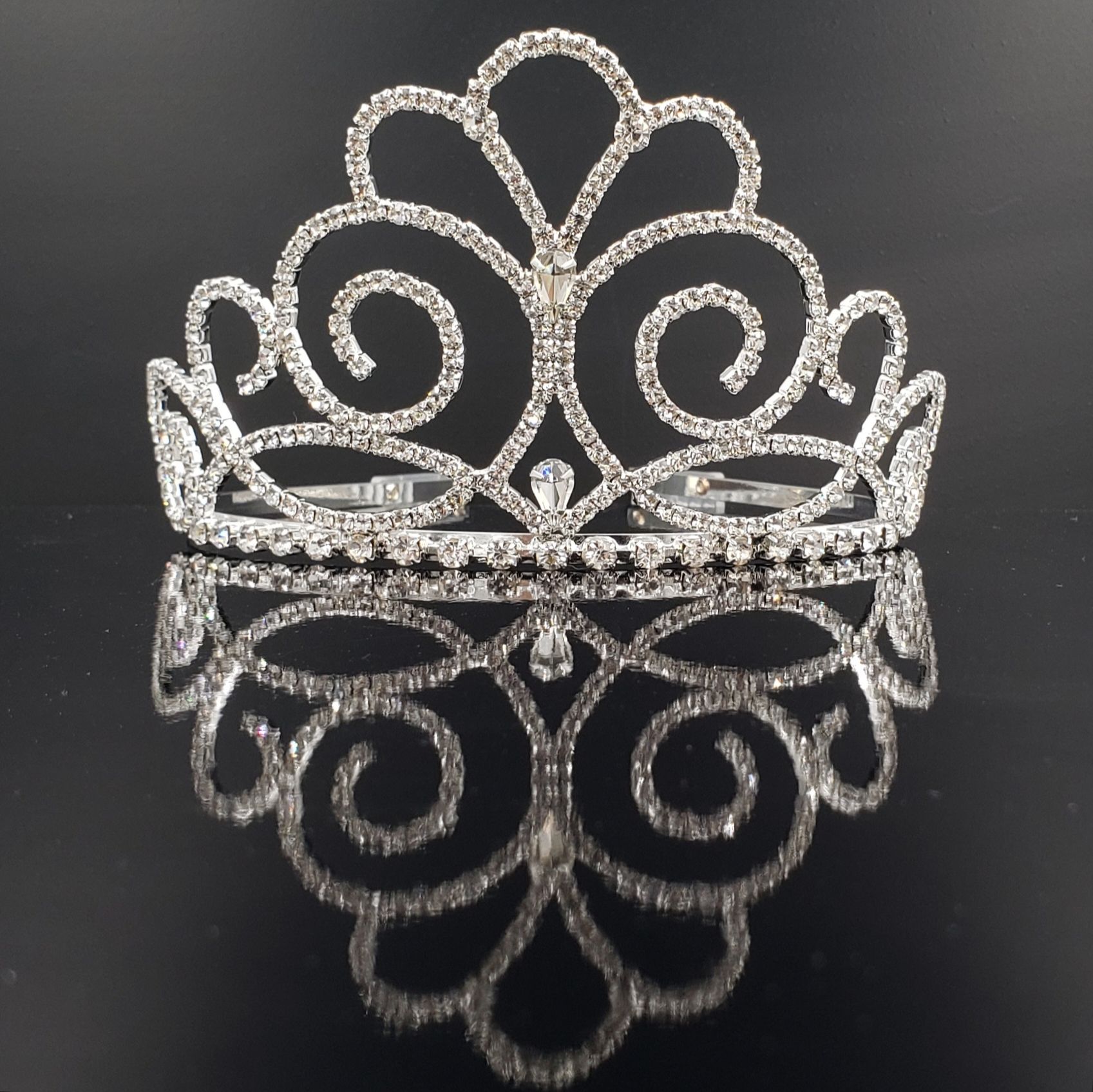 Beautifully designed and with great height, we offer our Splendor Crown Tiara. Plated in Sterling Silver and covered with Crystal Rhinestones, holds in place with combs on each end. Our newest addition to the collection of Tiara Crown we offer here at The Sash Company. Fit for a queen, homecoming, pageantry, or a quinceanera, this will not disappoint! Measures 3" Tall.