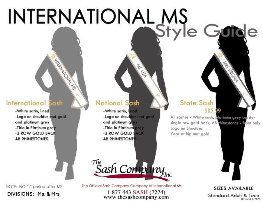 The International Ms State custom pageant sash refines beauty!Bordered and embroidered in platinum and one row of aurora borealis rhinestones on the front, the division and logo are stitched on the shoulder, and title, the year on the hip. Simply Elegant!