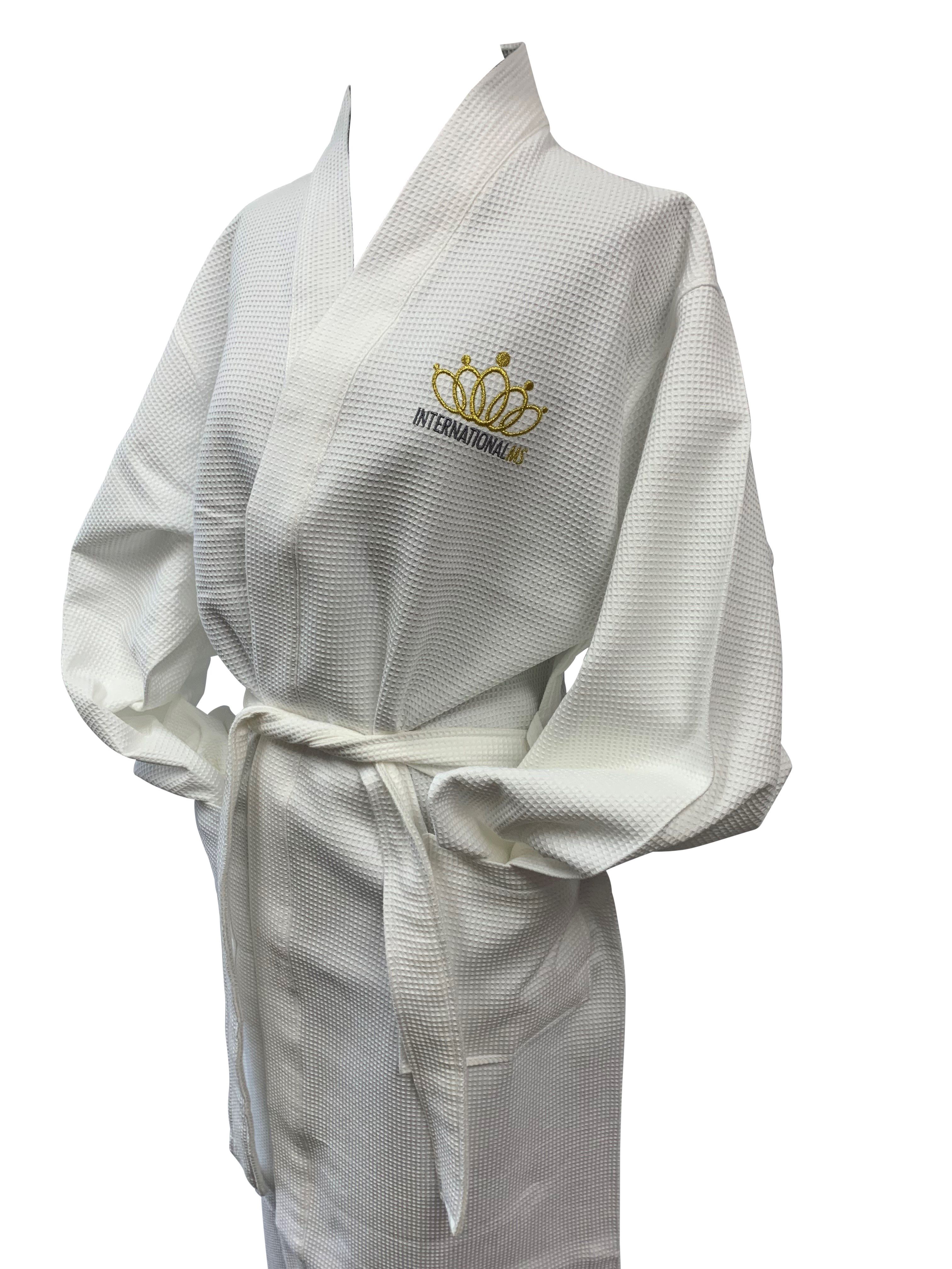Wrap yourself up in this luxurious White Spa Robe custom made with the International Ms logo. Spa Robe has a waffle texture that adds another level of comfort. Robe is 2 pocket, for comfort and stuff! Perfect for behind the stage changes and photo shoot makeup. Adult size –one fits most.