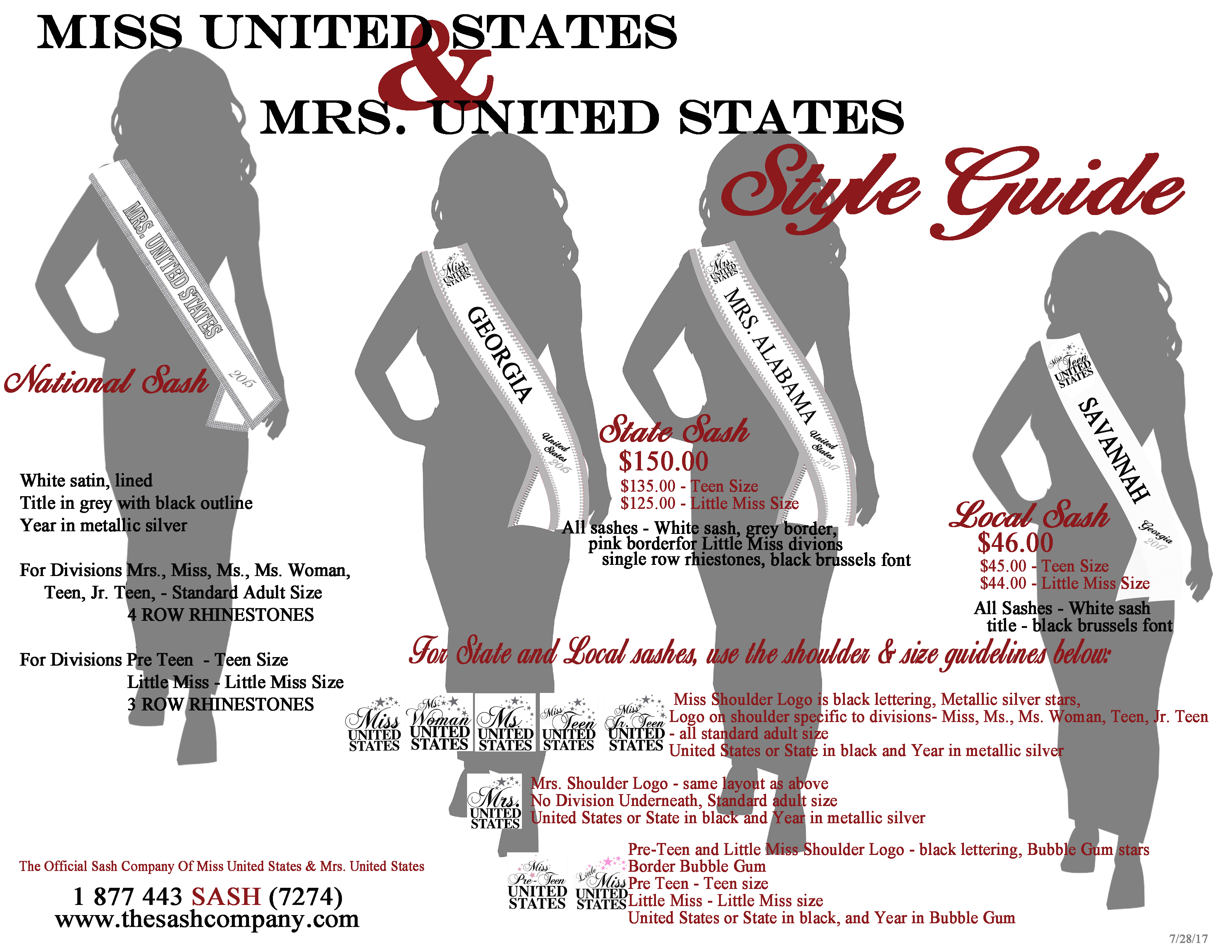 The Official sash of the Miss United States pageant system, with outlined lettering and four rows of rhinestones edging the entire sash, this sash is absolutely stunning! The sashes in the Miss United States Collection are orderable only by the National office.